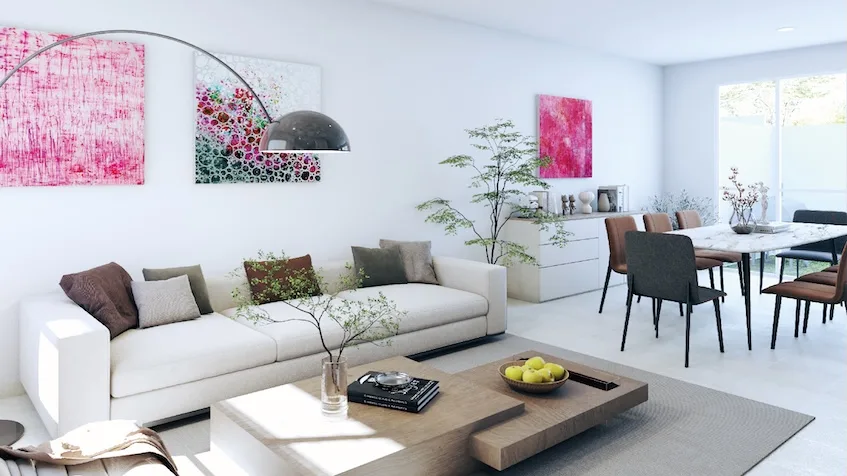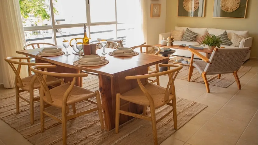 The design incorporates a minimalist style with neutral tones and natural finishes.