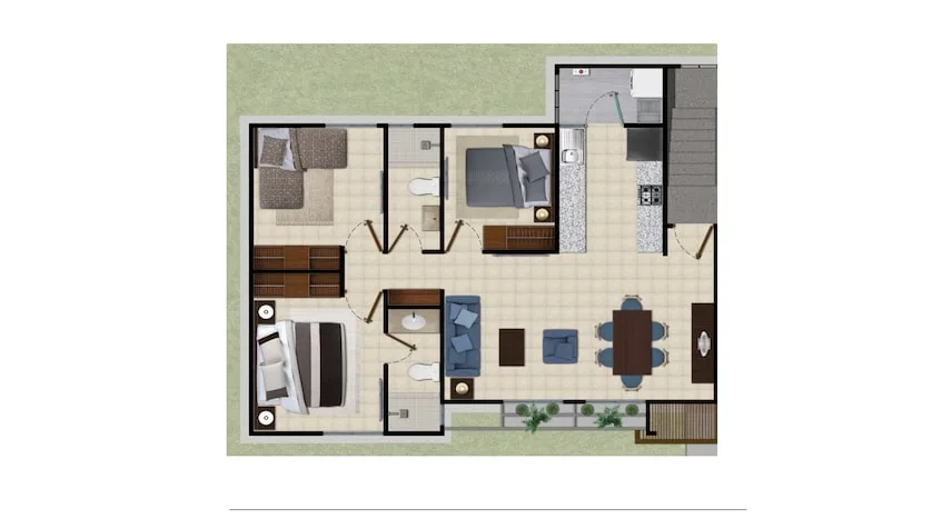 Available unit types include 1-bedroom condos of approximately 45 square meters. Each features one full bathroom, a terrace, an equipped kitchen, a walk-in closet, a washer-dryer, and a storage room. Also available are 2-bedroom condos of approximately 90 square meters. Each includes two full bathrooms, a terrace, a balcony, a living-dining area, walk-in closets, a washer-dryer, a dishwasher, a range hood, a storage room, and a lock-off option.