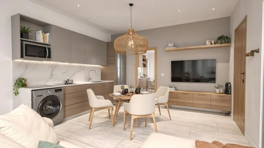 Available unit types include one-bedroom apartments of 45 square meters and two-bedroom apartments of 90 square meters. Apartments feature fully equipped kitchens, walk-in closets, washer and dryer hookups, and storage. Two-bedroom units include two full bathrooms, a balcony, and a combined living and dining area.