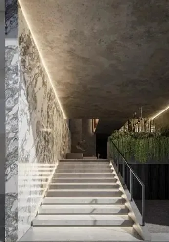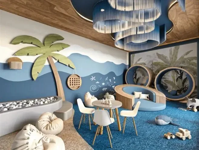 The building features a lobby, a children's play area, parking, a jacuzzi, a restaurant, a sauna, an elevator, a swimming channel, a bar, a massage area, a business center, a fire pit, green areas, hydrotherapy, a gym, and sun loungers.