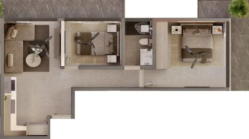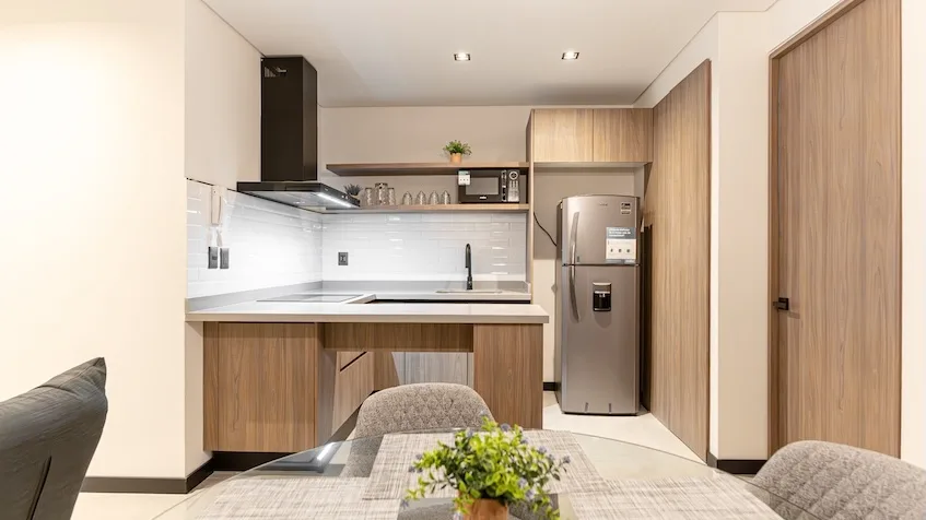 Available two-bedroom condos include two full bathrooms, a living and dining area, an equipped kitchen, and a terrace. Studio units feature a combined living-dining area, an equipped kitchen, and one full bathroom.