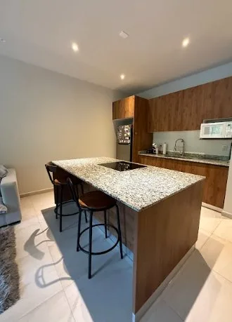 The unit features a living and dining room, an equipped kitchen, and three bedrooms with closets. There are two bathrooms, a laundry room, and a balcony. The residence includes four mini-split air conditioning units, custom carpentry, and a deeded parking space. The homeowners association fees are 1, 500 MXN.