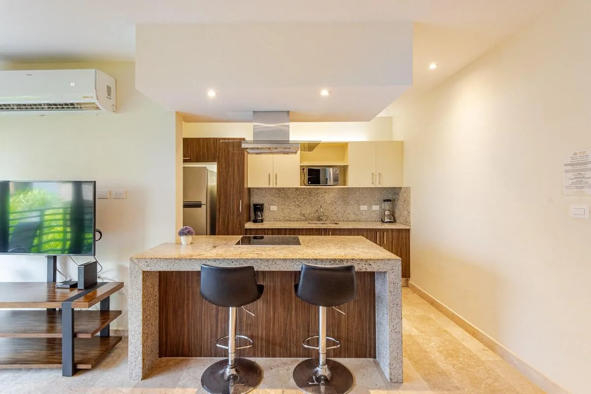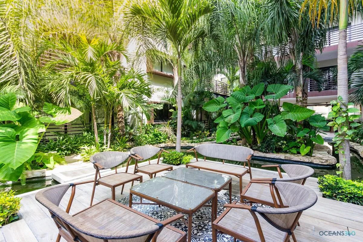 Experience the best of Playa del Carmen in this elegant and fully furnished one-bedroom unit, ideal as a home or an investment. The property contains a living area, a kitchen equipped with an oven, a laundry area, a balcony overlooking the building's interior gardens, a bedroom with a closet, and a fully appointed bathroom.