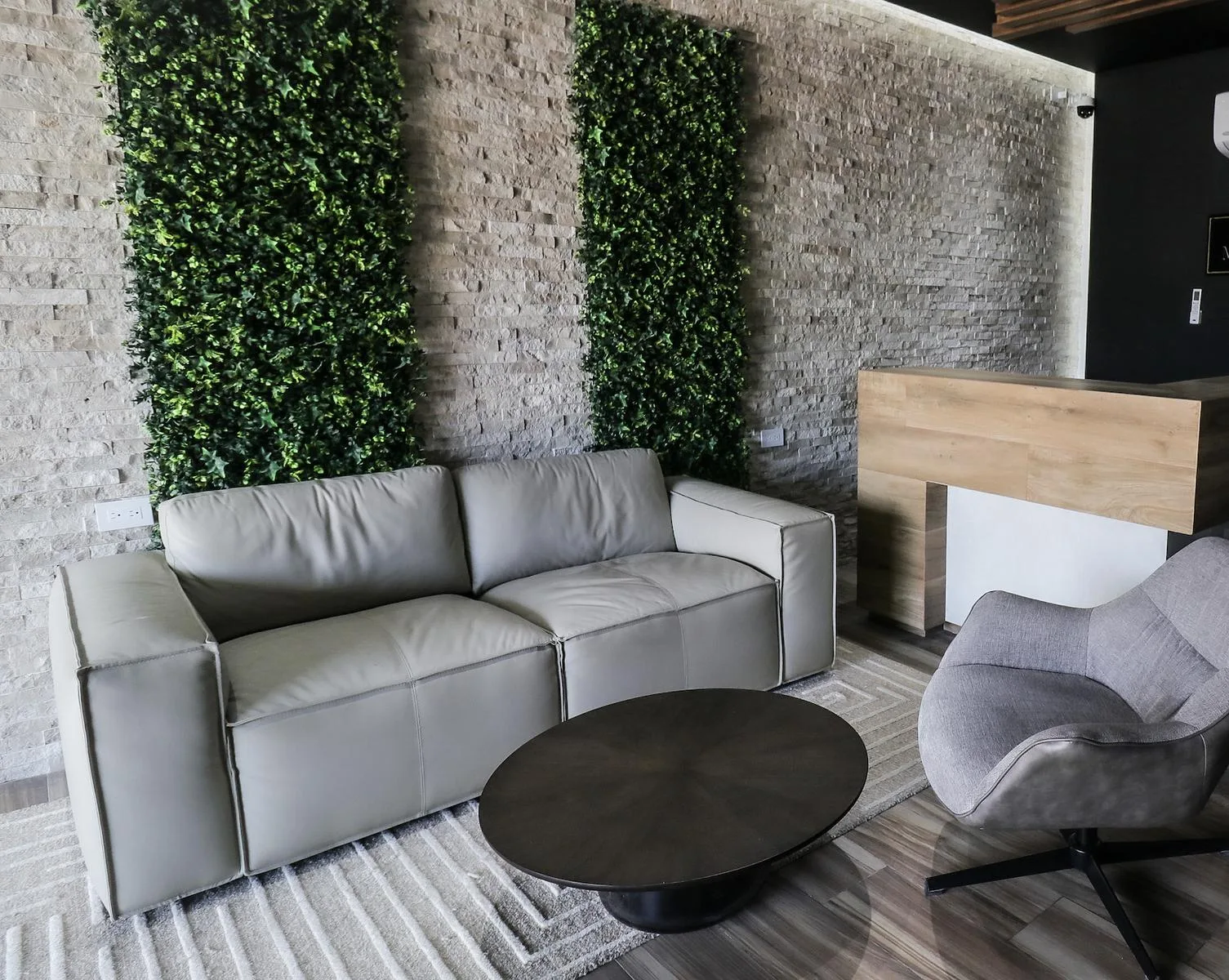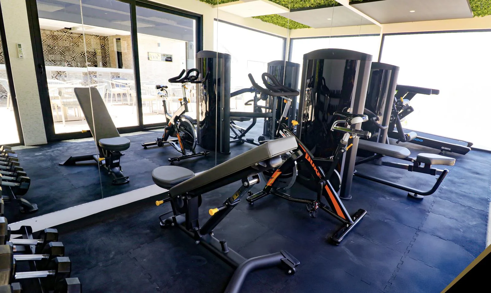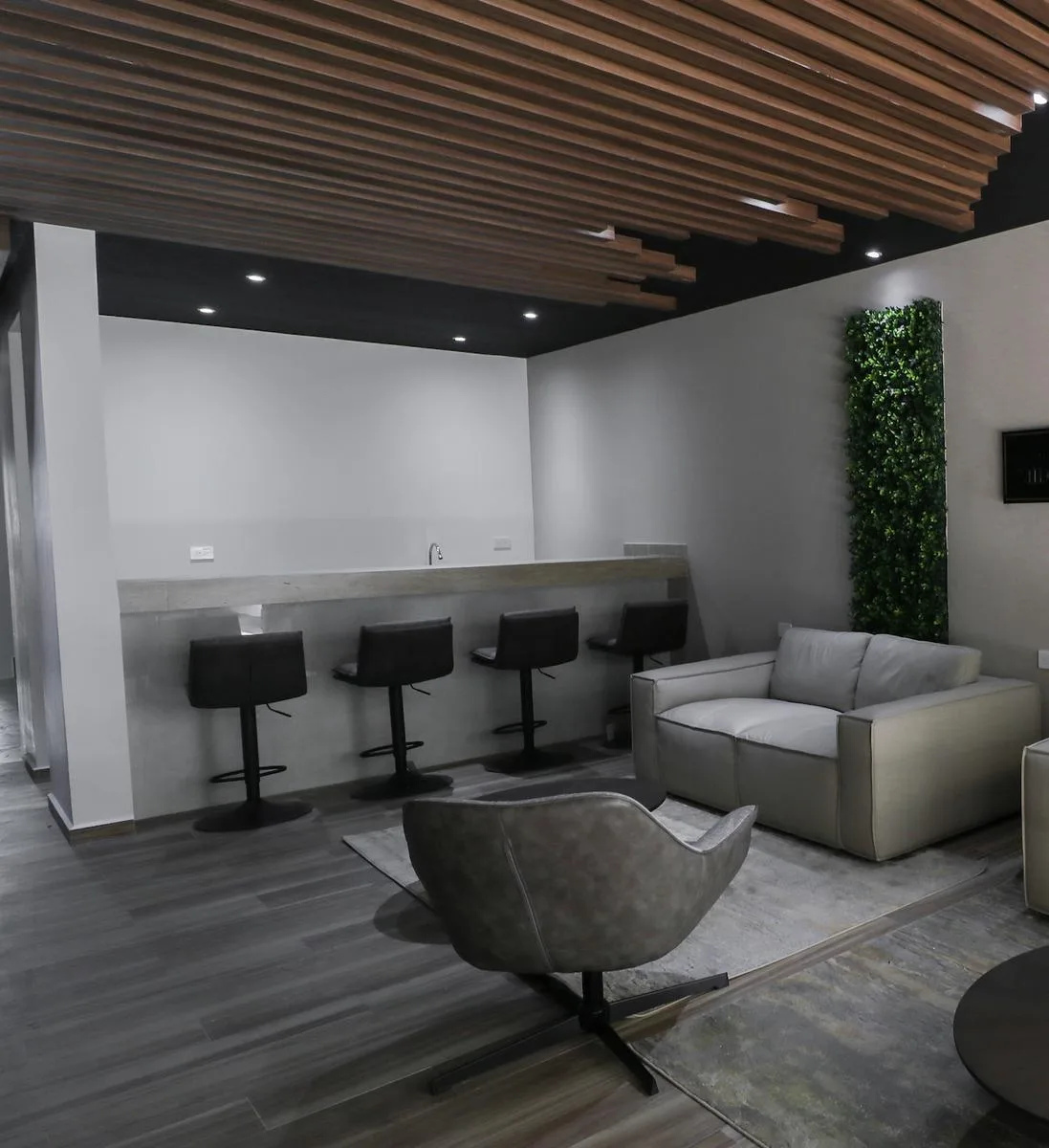 The building provides a range of amenities including a reception area, an elevator, and a rooftop with a swimming pool and solarium. Additional building features include a gym and a coworking space.