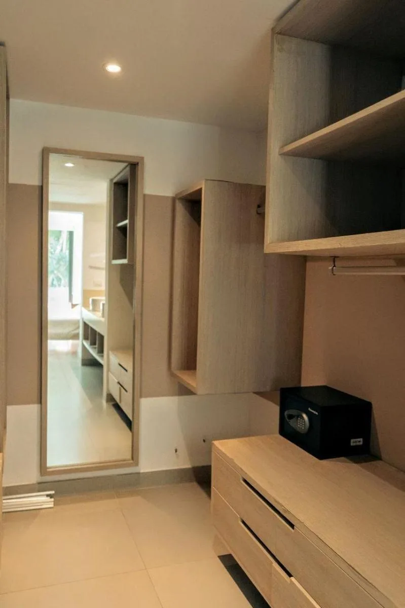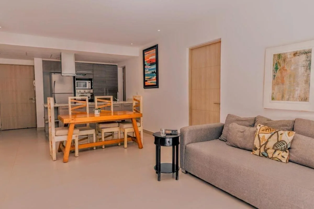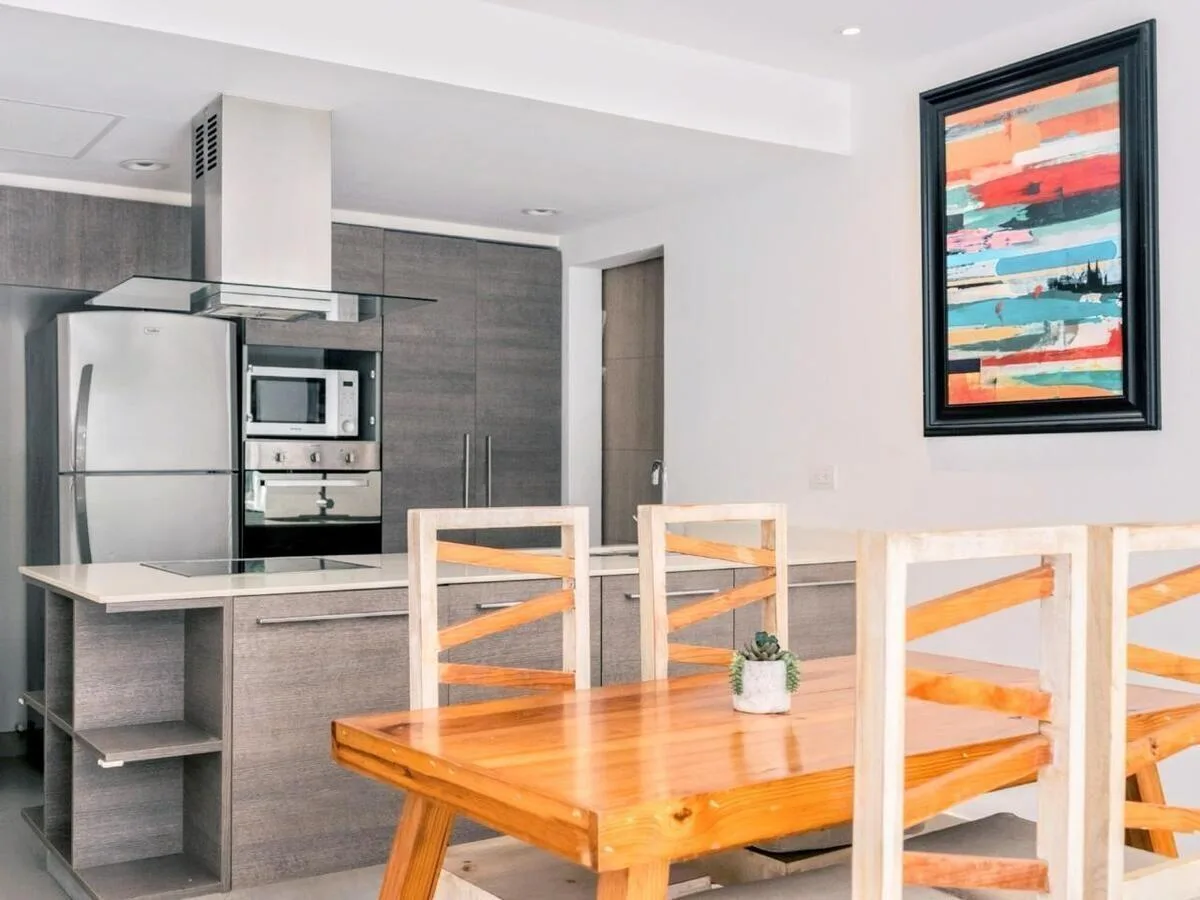 The layout includes two spacious bedrooms with excellent natural light and two fully modern bathrooms. The residence features a private terrace with direct access to the pool area. The unit includes one dedicated parking space.