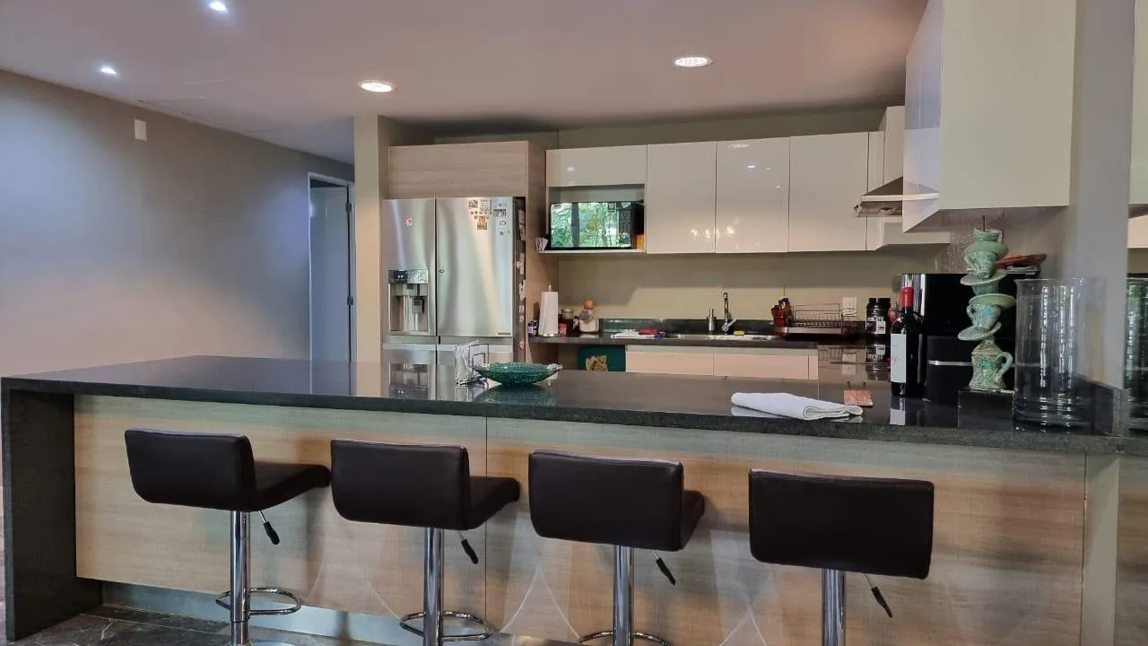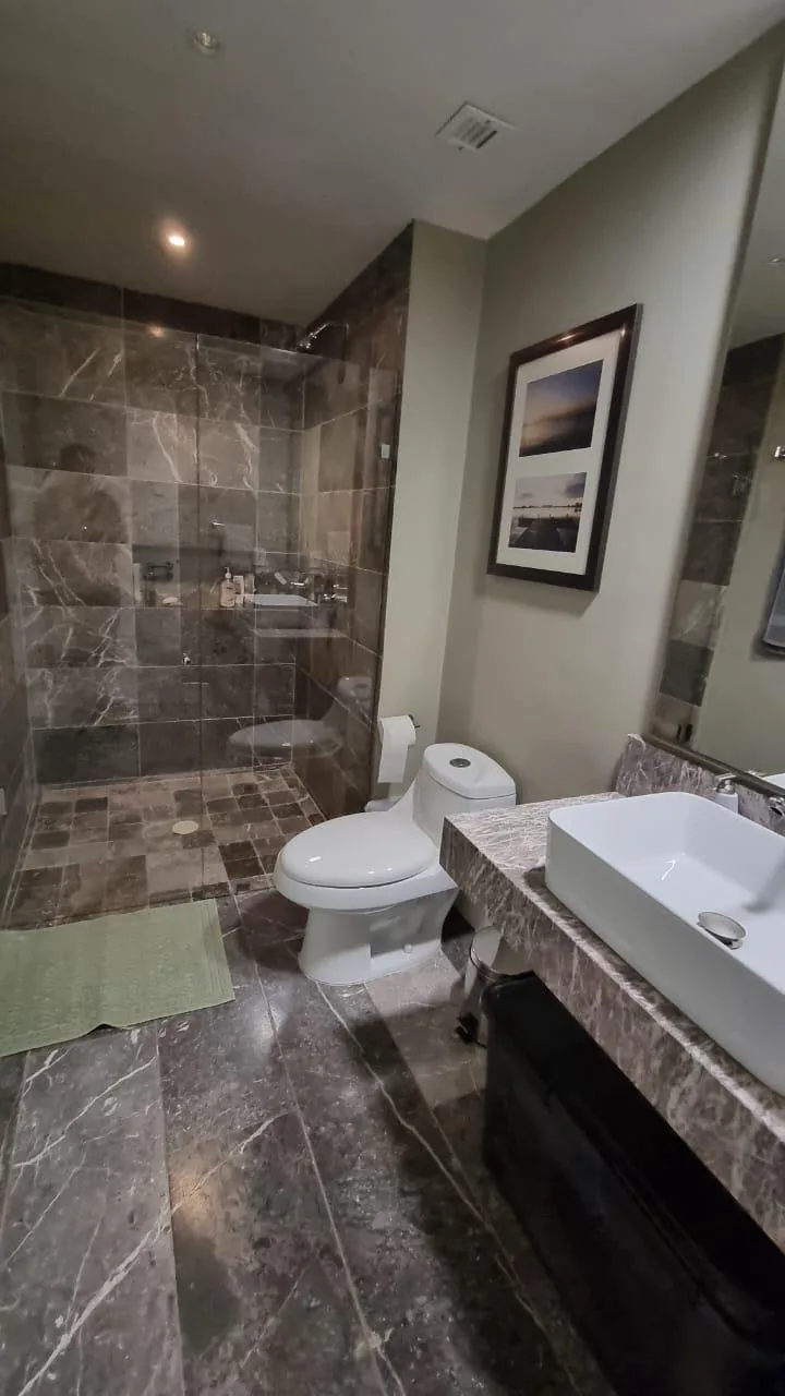 The main bedroom suite includes a walk-in closet and a full bathroom. The two additional bedrooms each have their own private bathroom. Interior finishes consist of porcelain tile floors, air conditioning, and built-in closet carpentry. The condominium is in excellent condition.