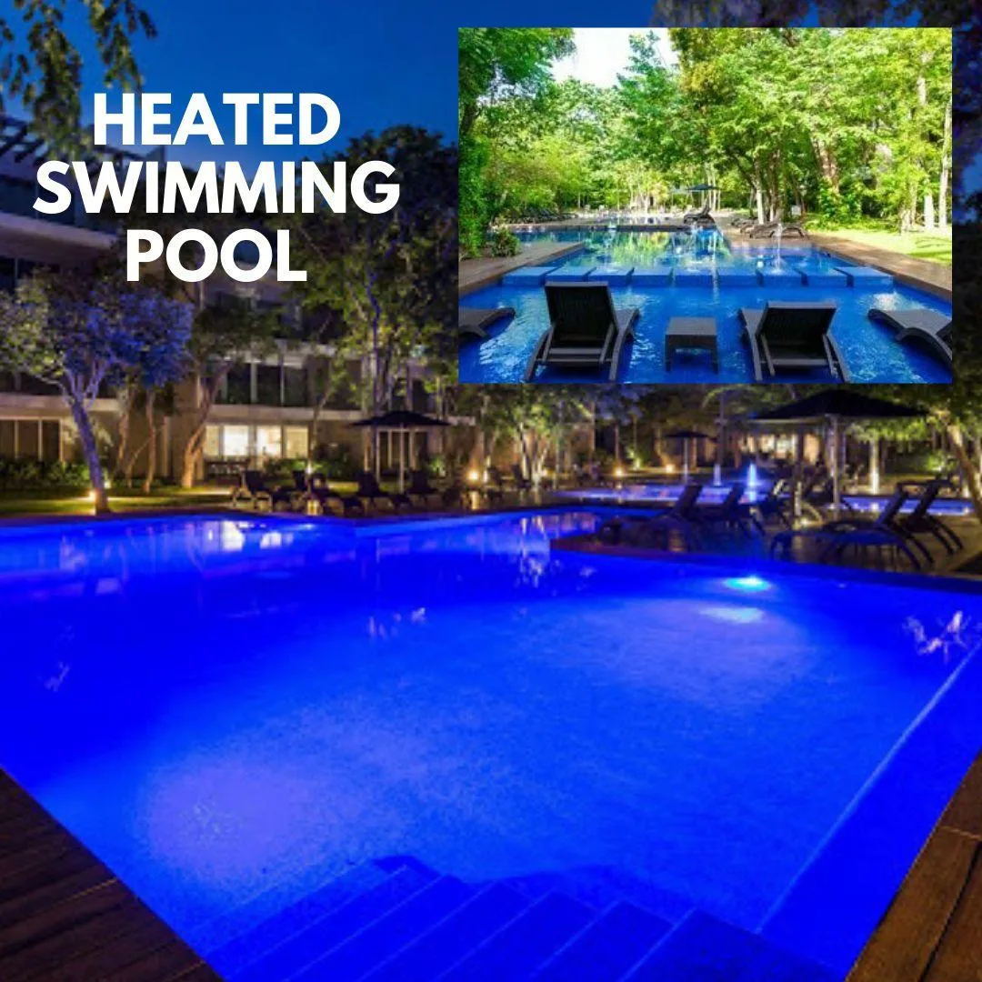 Building amenities include a swimming pool, a complete gym, a solarium, a lobby, and underground parking with 24-hour security. The development features a central garden patio and covered walkways connecting the towers.