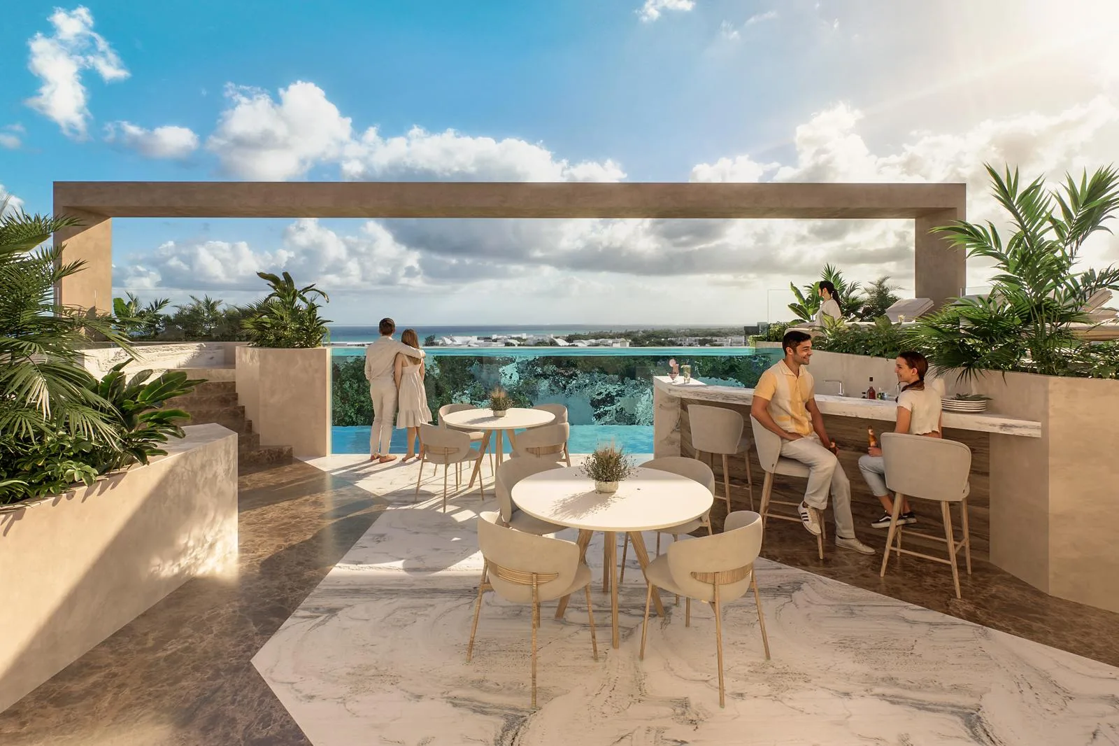 The building features a welcoming lobby, a fully equipped gym, and a coworking space for remote work. Residents can enjoy a dedicated coffee bar, a sky bar for socializing, and an infinity pool with sunset views.