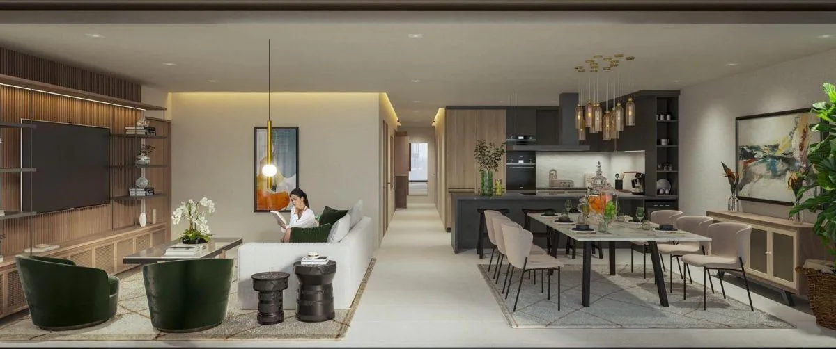 The unit is designed with premium finishes and spacious areas, featuring a private terrace and a fully equipped contemporary-style kitchen. The location is near Fifth Avenue, golf courses, and the Caribbean's best beaches.