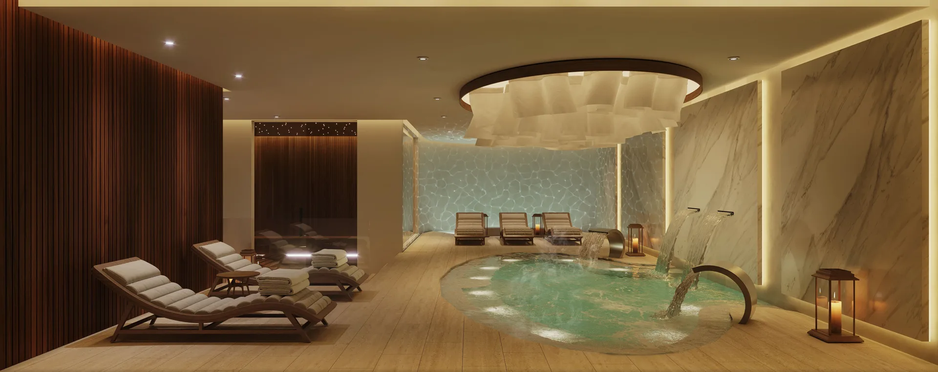 Building amenities include a lobby with concierge service, a spa, and a rooftop area. The rooftop features a pool with panoramic views, a jacuzzi, and a fire pit. The property includes a parking lot.