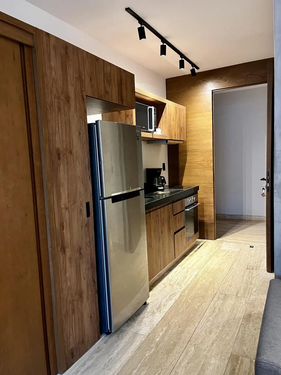 The unit features a complete integrated kitchen with a large refrigerator and oven, a king-size bed, and a balcony facing Calle 26.