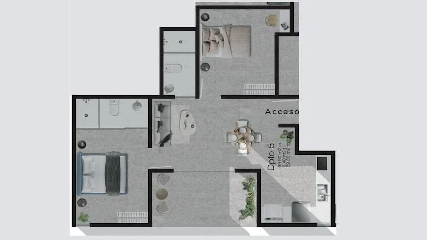 Available unit types include a one-bedroom apartment of 37 square meters. This layout features one bedroom, one full bathroom, an equipped kitchen, and a combined living and dining area. The two-bedroom apartment is 62 square meters and includes two bedrooms, two full bathrooms, an equipped kitchen, and a combined living and dining area. Both typologies come with closets and installed bathroom furniture.
