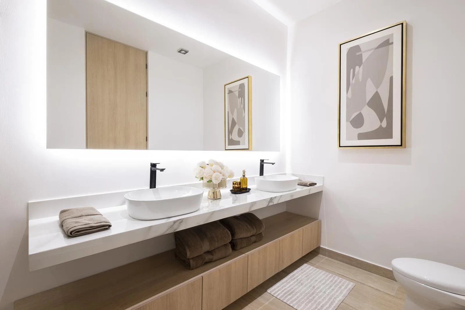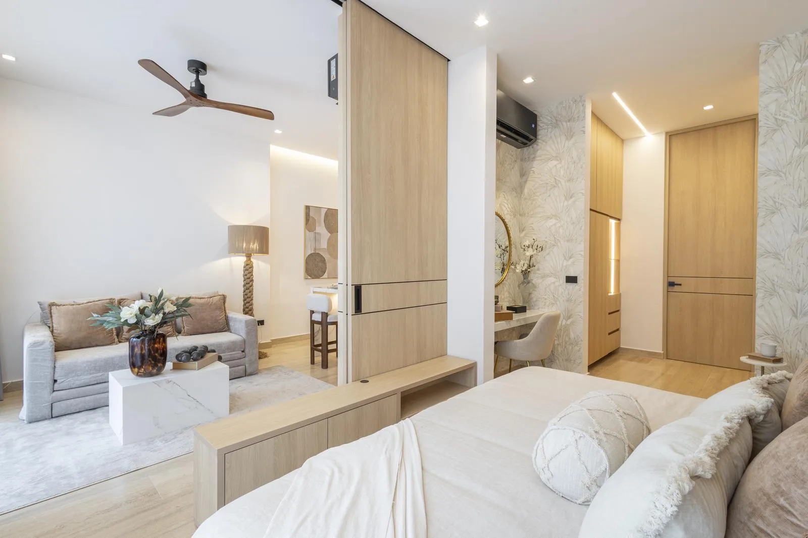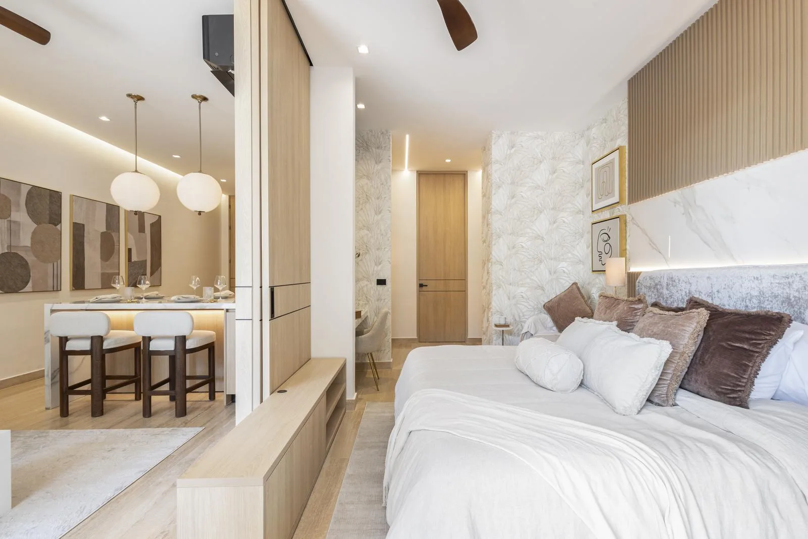 The building provides 24/7 concierge and security with controlled access from the park and Calle 26. The main entrance features double-height ceilings. A business center and coworking space includes a 75-inch HD screen. A fully equipped spa includes a sauna, aromatherapy room, hydrotherapy pool, and cold plunge pool.
