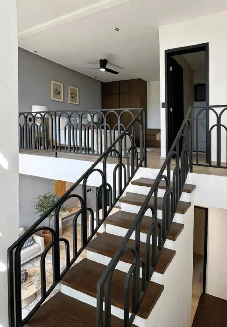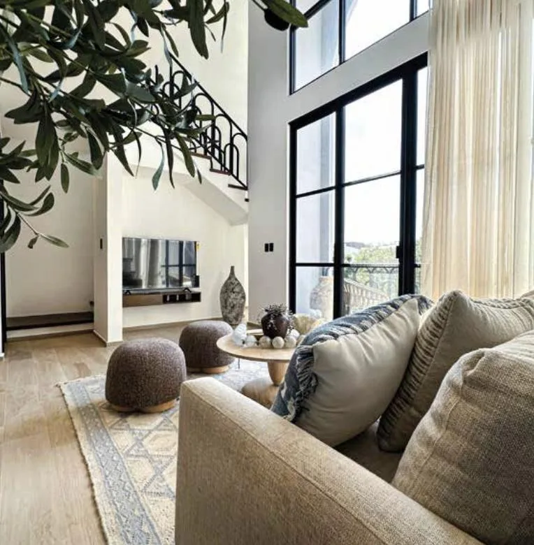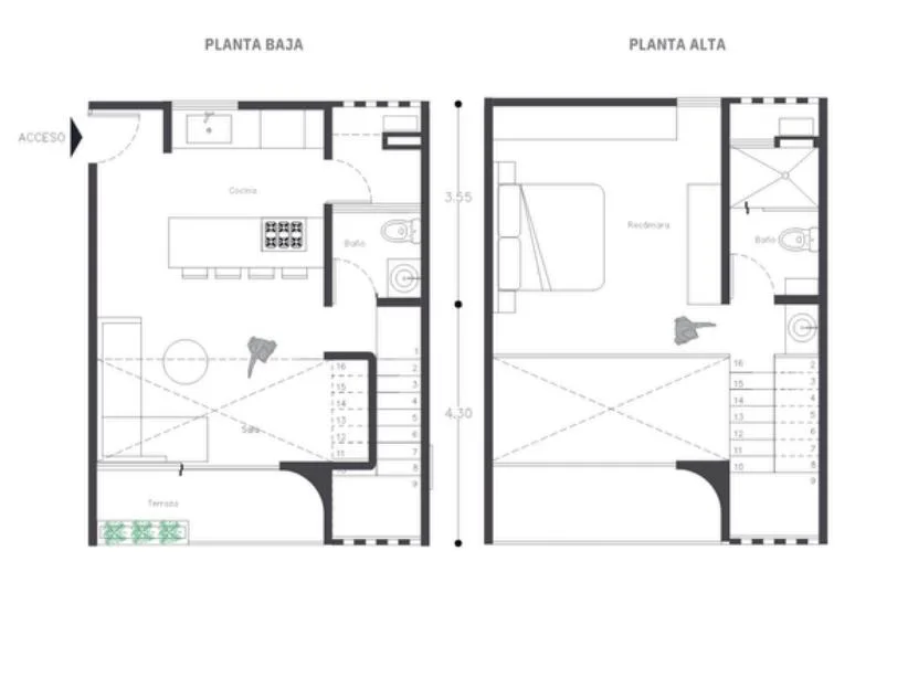 This double-height loft spans 80 square meters and includes one bedroom, one and a half bathrooms, an equipped kitchen, a combined living and dining room, and a laundry area.