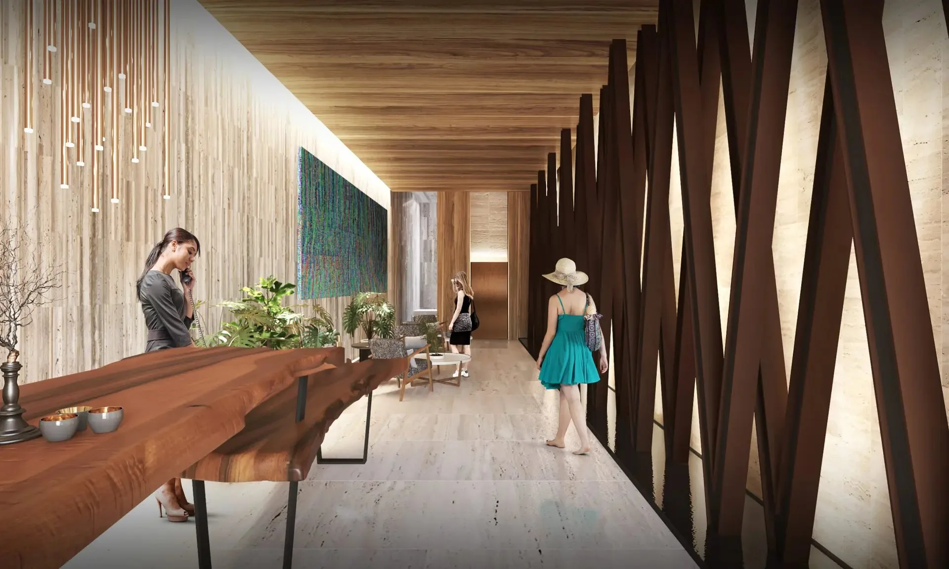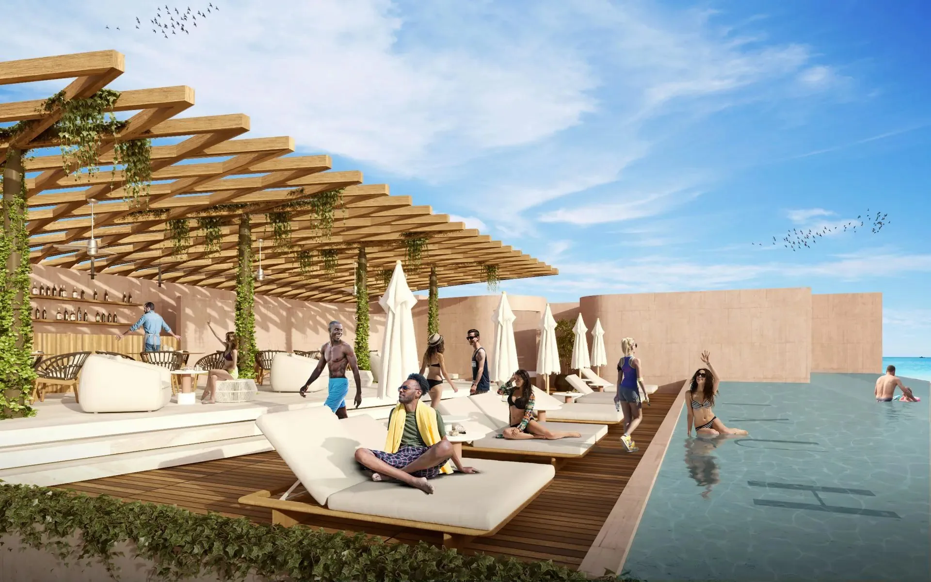 The building includes a controlled-access lobby on the ground floor, along with parking. The rooftop features a swimming pool, sun loungers, a grill area, a skybar, a fitness center, and a coworking space.