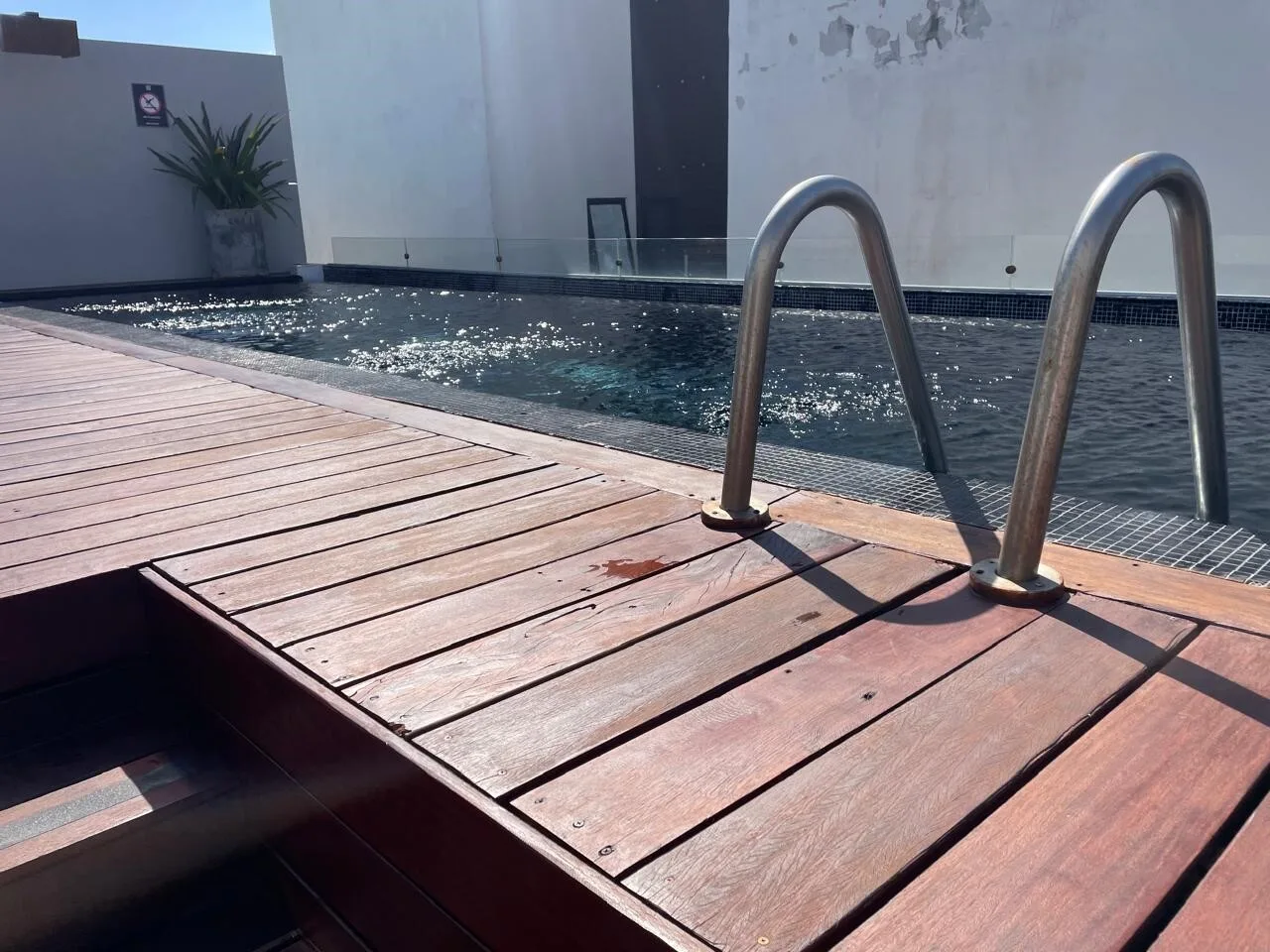 The building features a rooftop with first-class amenities. These include two designer pools offering distinct environments for relaxation and recreation. The rooftop also contains a private bar and restaurant, along with a panoramic solarium area with lounge chairs and seating to enjoy expansive views.