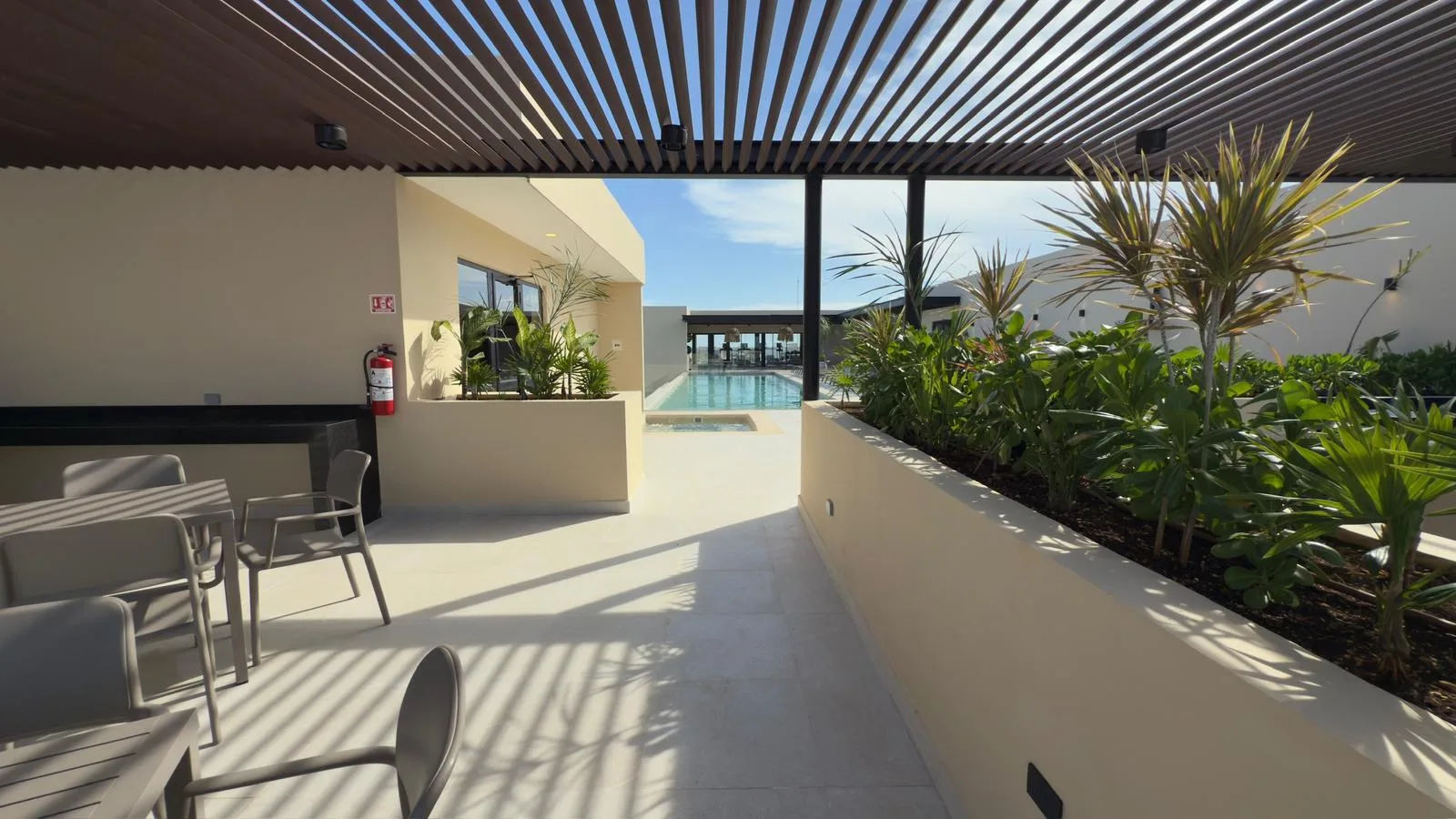 Building amenities include a lobby, storage units, underground parking, an elevator, a rooftop with a swimming pool, a grill area, a gym, and a yoga area, among others.