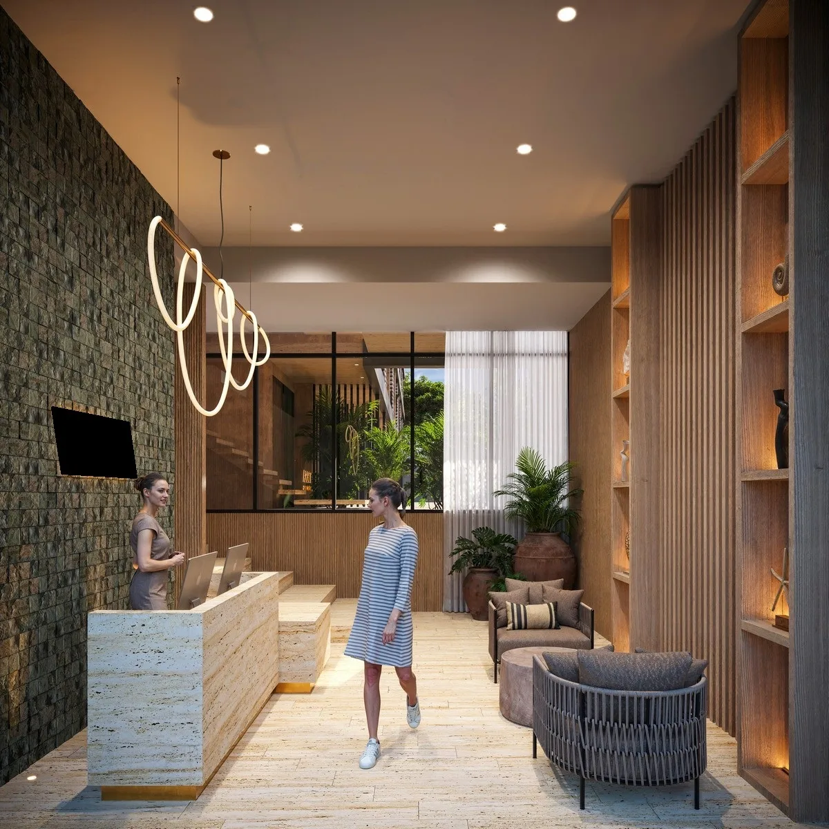 The building provides an extensive array of resort-style amenities. Outdoor facilities include a swimming pool, two jacuzzis, a rooftop solarium with ocean views, hammock terraces, a fire pit, and landscaped gardens with an open-air cinema. For business and convenience, there is a business center, free Wi-Fi in common areas, and a controlled access lobby.