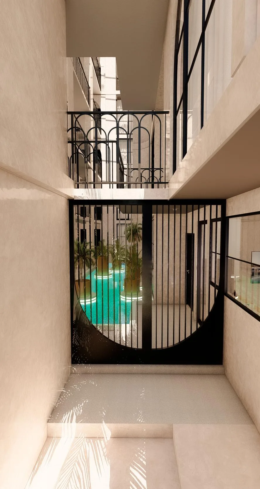 The building includes a luxury rooftop with a range of amenities. These feature an area for outdoor yoga with sea views, a fully equipped gym, an infinity pool, and a jacuzzi.
