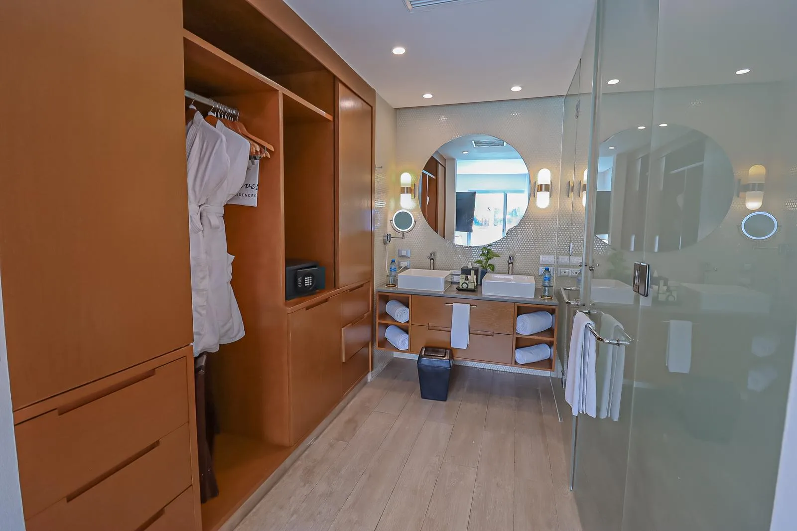 Residents have access to extensive amenities including a private beach club, five swimming pools, two infinity pools, fifteen restaurants and gourmet dining spots, five signature bars, and four pool bars. Additional building features consist of a world-class spa, a fitness center, a tennis court, a basketball court, a children's playhouse, a dedicated teen game room, a central plaza, and an on-site coffee shop. Butler service is also available.