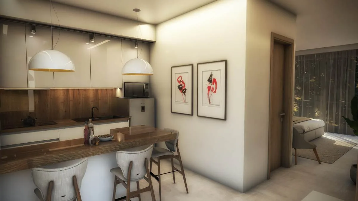 This exceptional one-bedroom studio features a combination of organic finishes and local materials, creating a nature-inspired living environment focused on well-being.