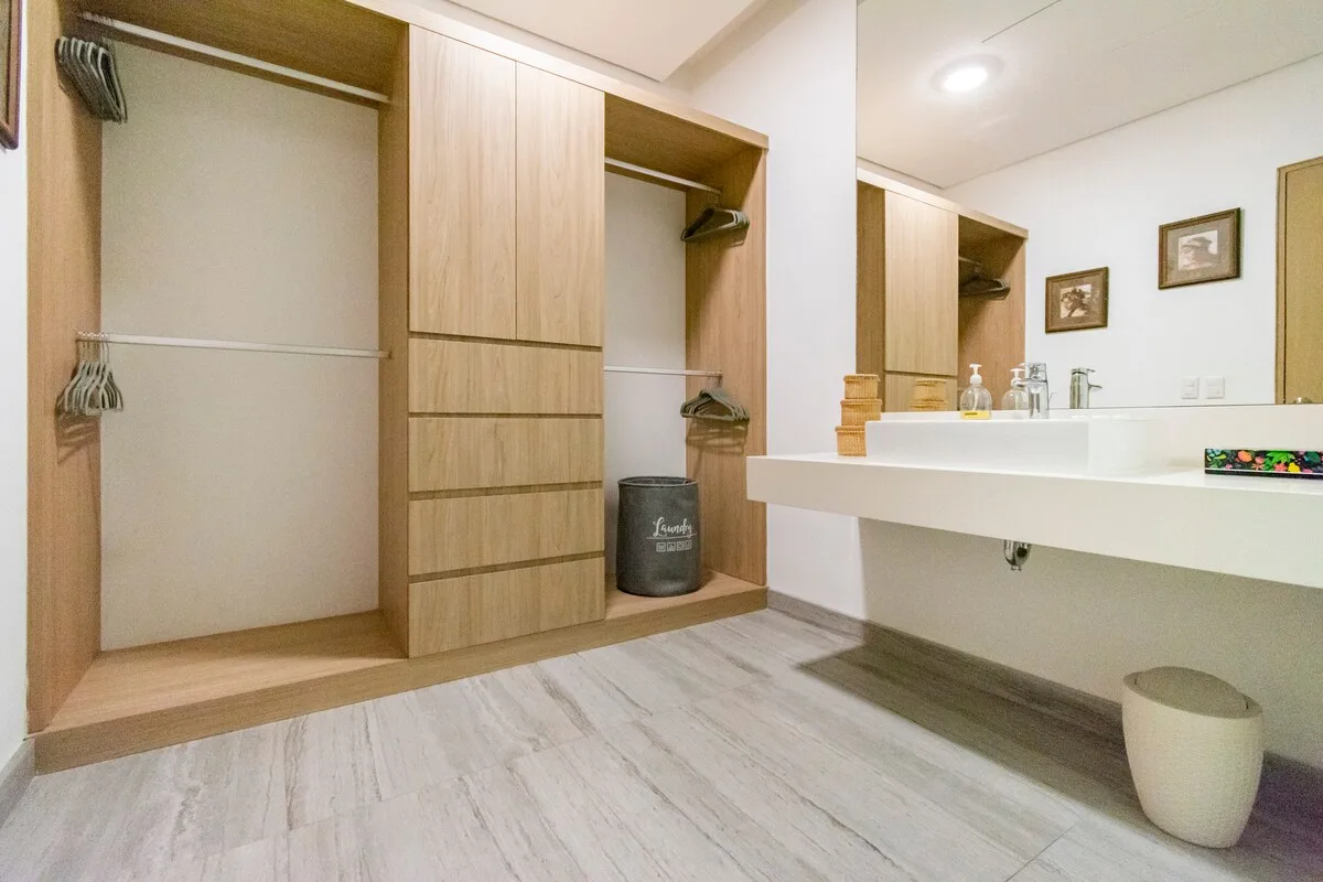 The master bedroom features private access to the balcony, a luxurious en-suite bathroom designed for two, and a spacious walk-in closet. The second bedroom is located separately at the end of the hallway and offers large windows overlooking a bird sanctuary, an en-suite bathroom, and a walk-in closet. The third bedroom also has large jungle-view windows, an en-suite bathroom, and a walk-in closet. The fourth bedroom is designed with two twin beds and playful decor and has access to an adjacent bathroom. A fully equipped laundry room and additional kitchen storage are included.