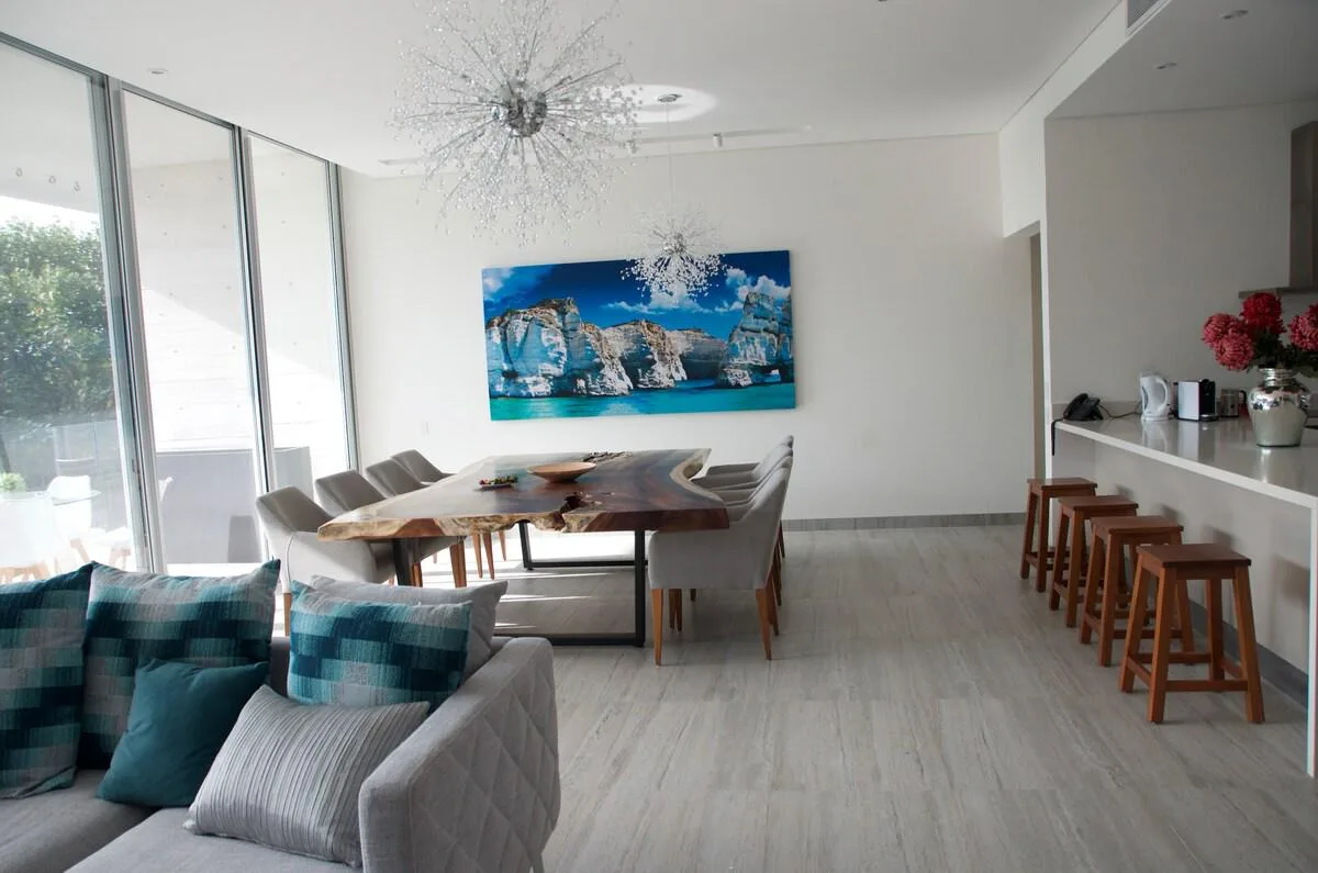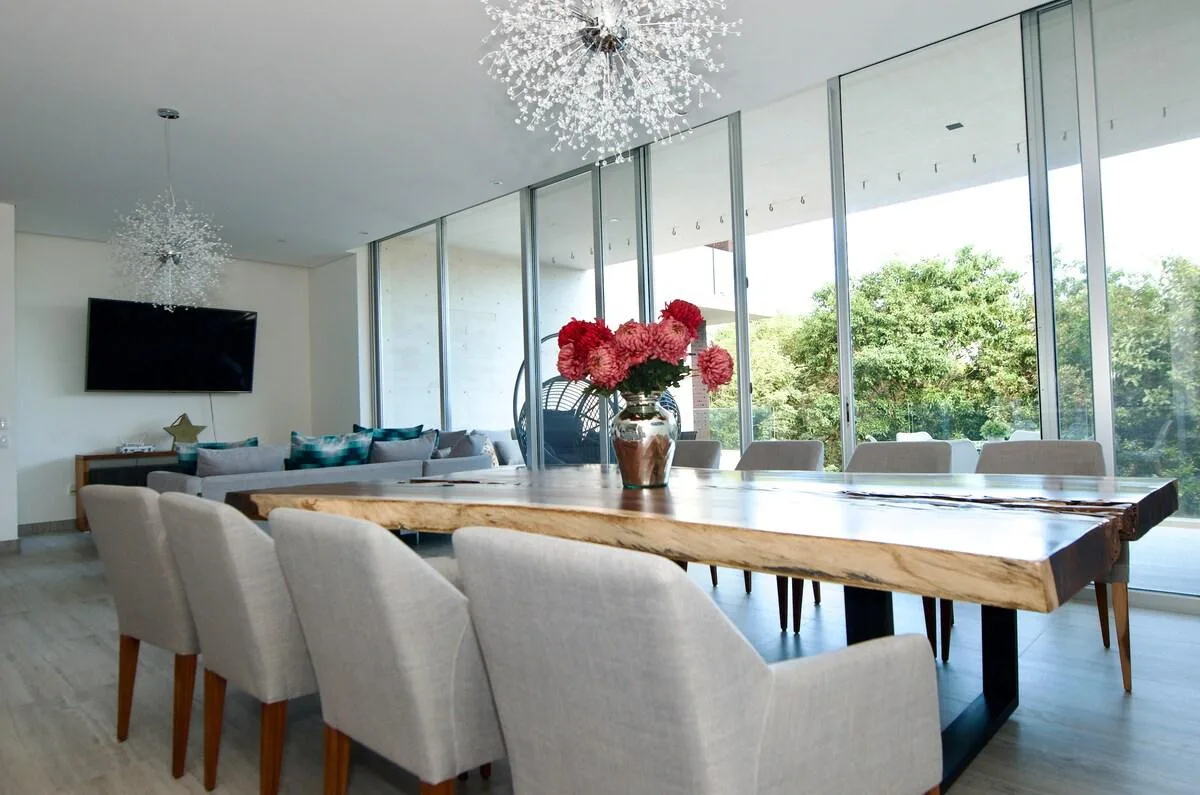 This spacious condo features 4 bedrooms and 3. 5 bathrooms across 250 square meters (2, 690 square feet). The open-concept design includes a wide entrance opening into an airy living room, dining room, and a fully equipped kitchen. Floor-to-ceiling sliding glass doors open fully, integrating the indoor and outdoor spaces. Three-meter-high ceilings enhance the sense of volume.