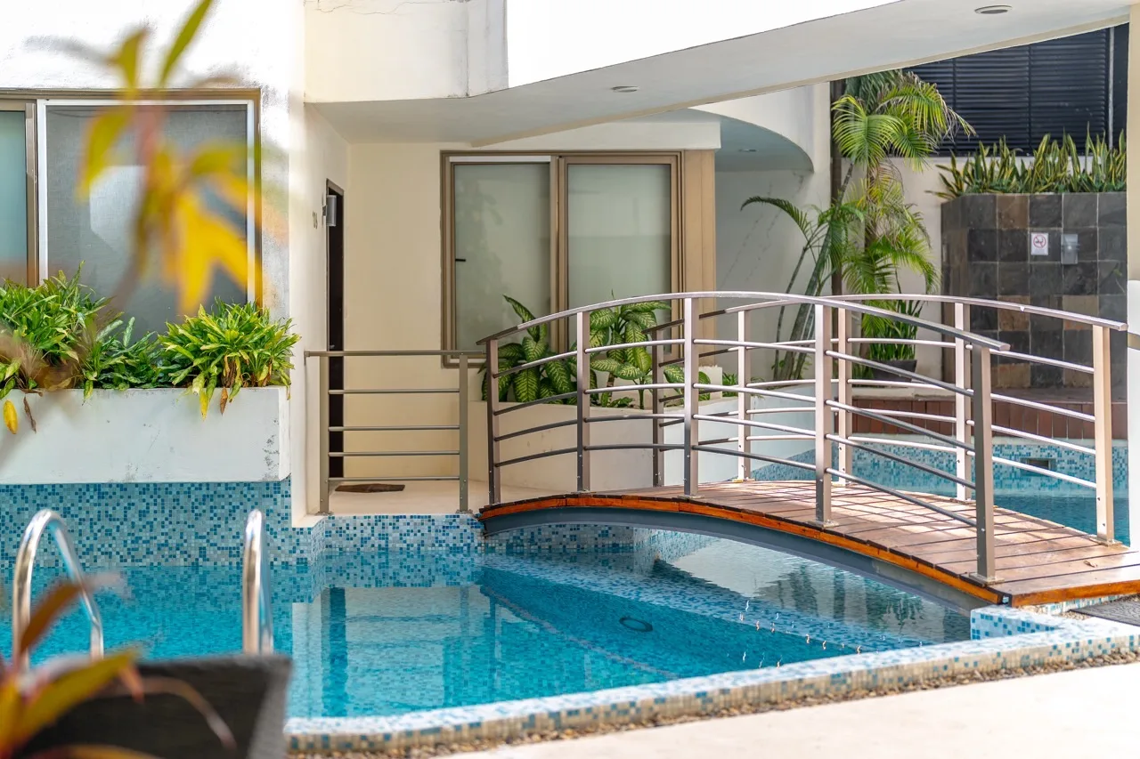 Designed with long stays in mind, the unit features an open-plan living and kitchen area with a kitchen island and natural light. Two private balconies offer views of the pool area. The bedroom is generous in size and well-separated from the living space for privacy.