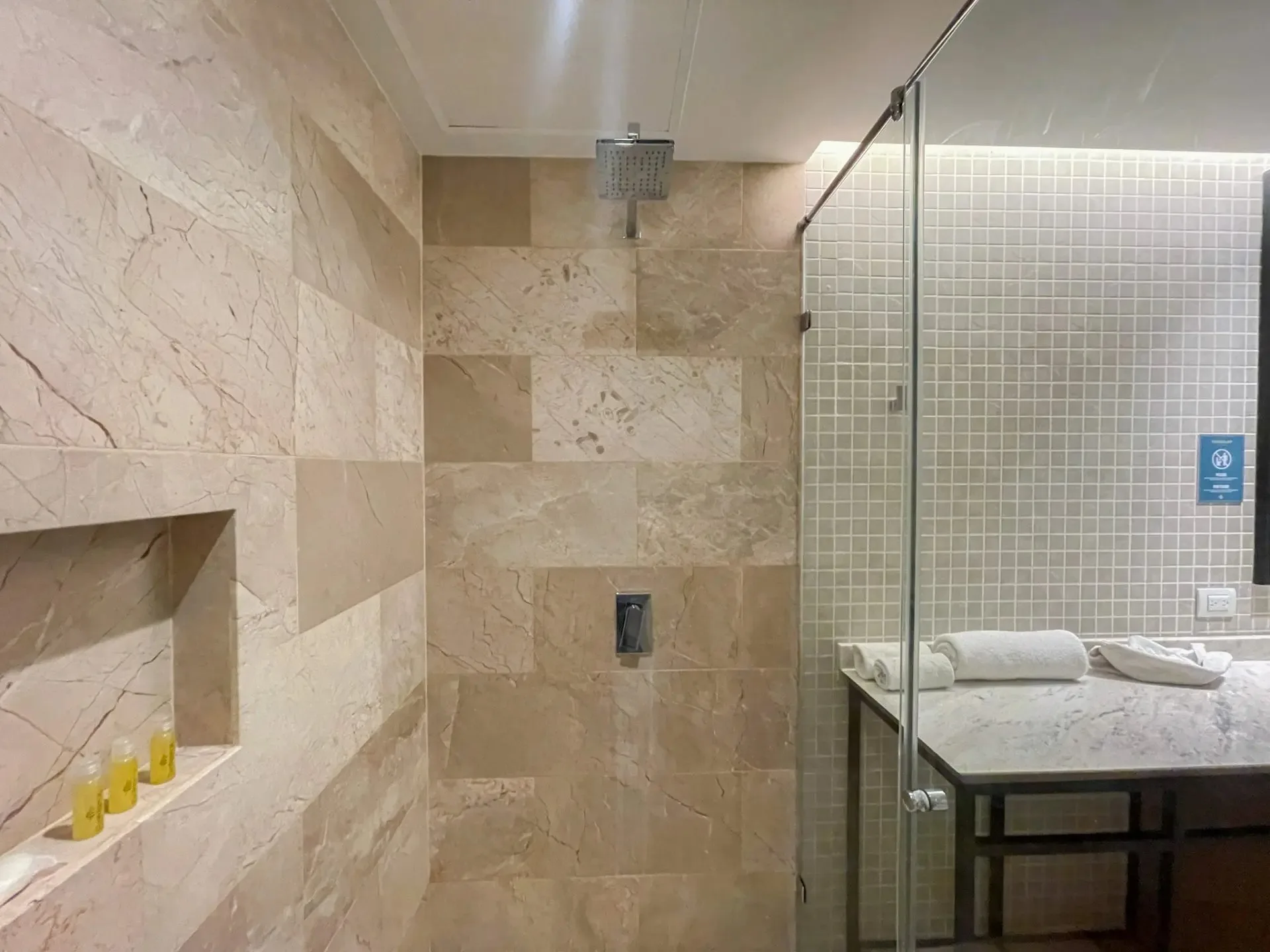 Amenities include a rooftop bar, three pools on the rooftop, a heated pool, a gym, a lobby, a laundry room, concierge service, a spa, room service, and a convenience store.