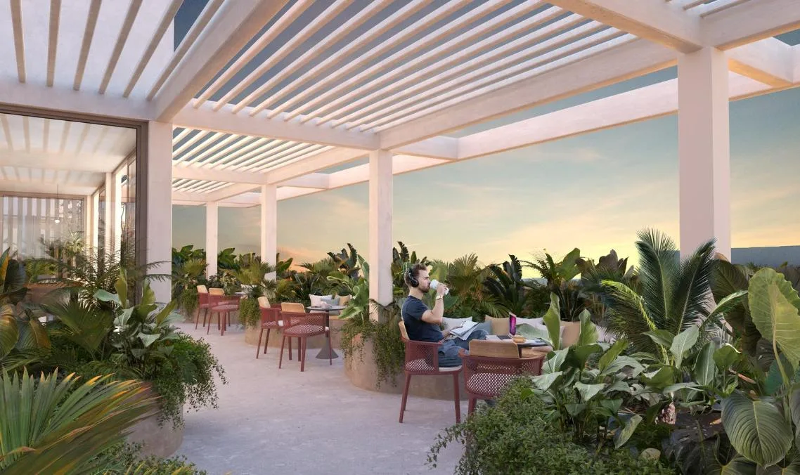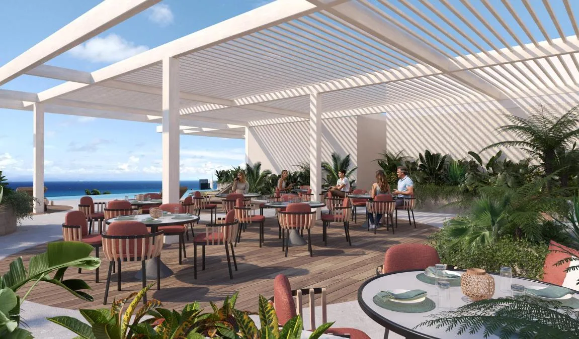 Building amenities include an infinity pool, a lounge area, a pool bar, a Sky Club, a gym, a coworking space, a sauna, a steam room, and a yoga area. The property is located in a central zone with high tourist demand.