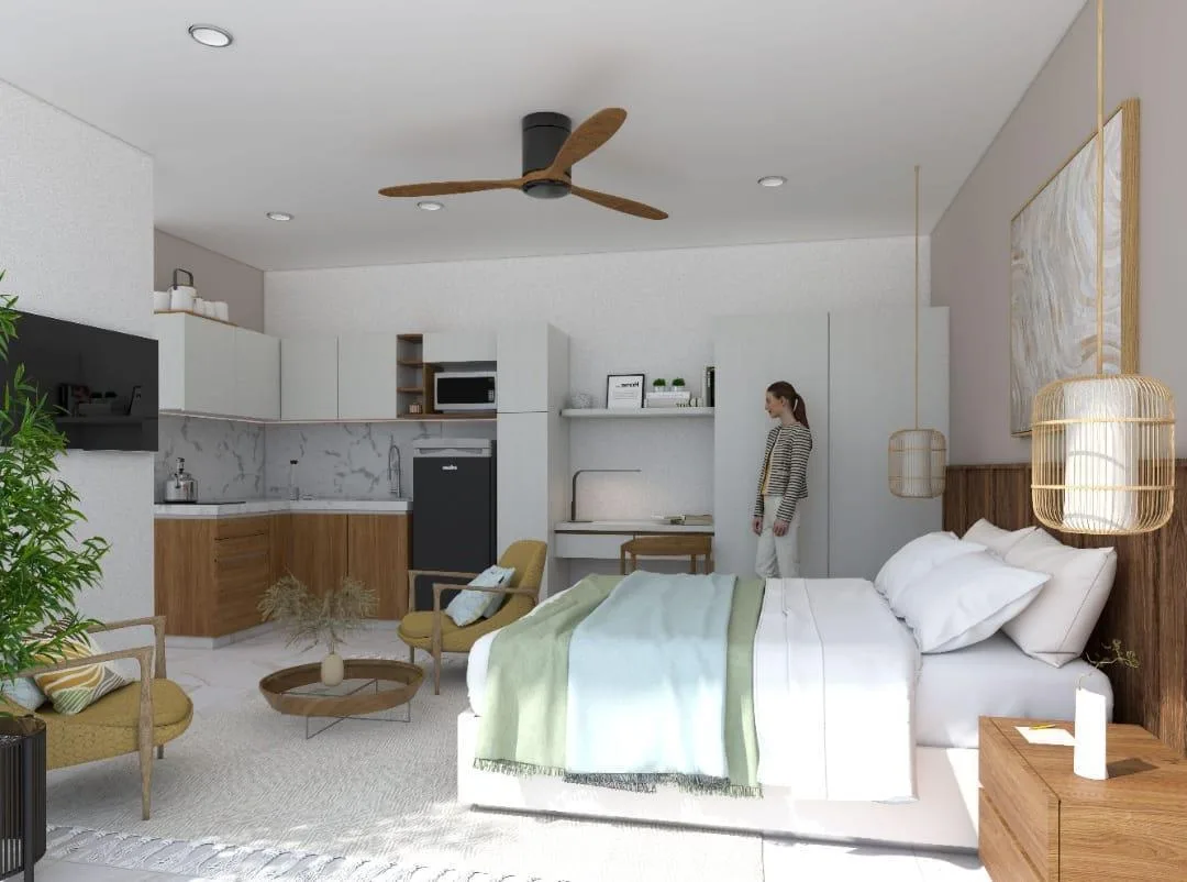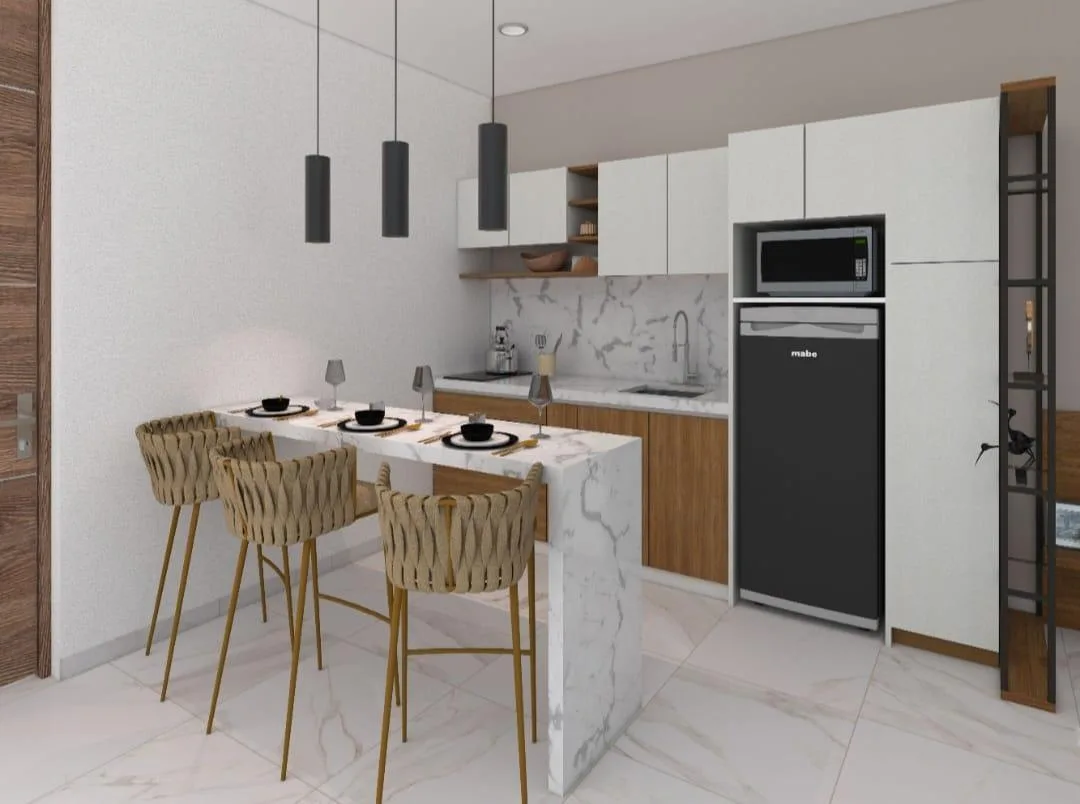 The unit features a fully equipped kitchen with white wood and parota cabinetry, an extractor hood, microwave, two bar stools, a 13-foot refrigerator, and a breakfast bar. The bathroom is equipped with a sink, toilet, a cabinet with a drawer, tempered glass, and a mirror with lighting.