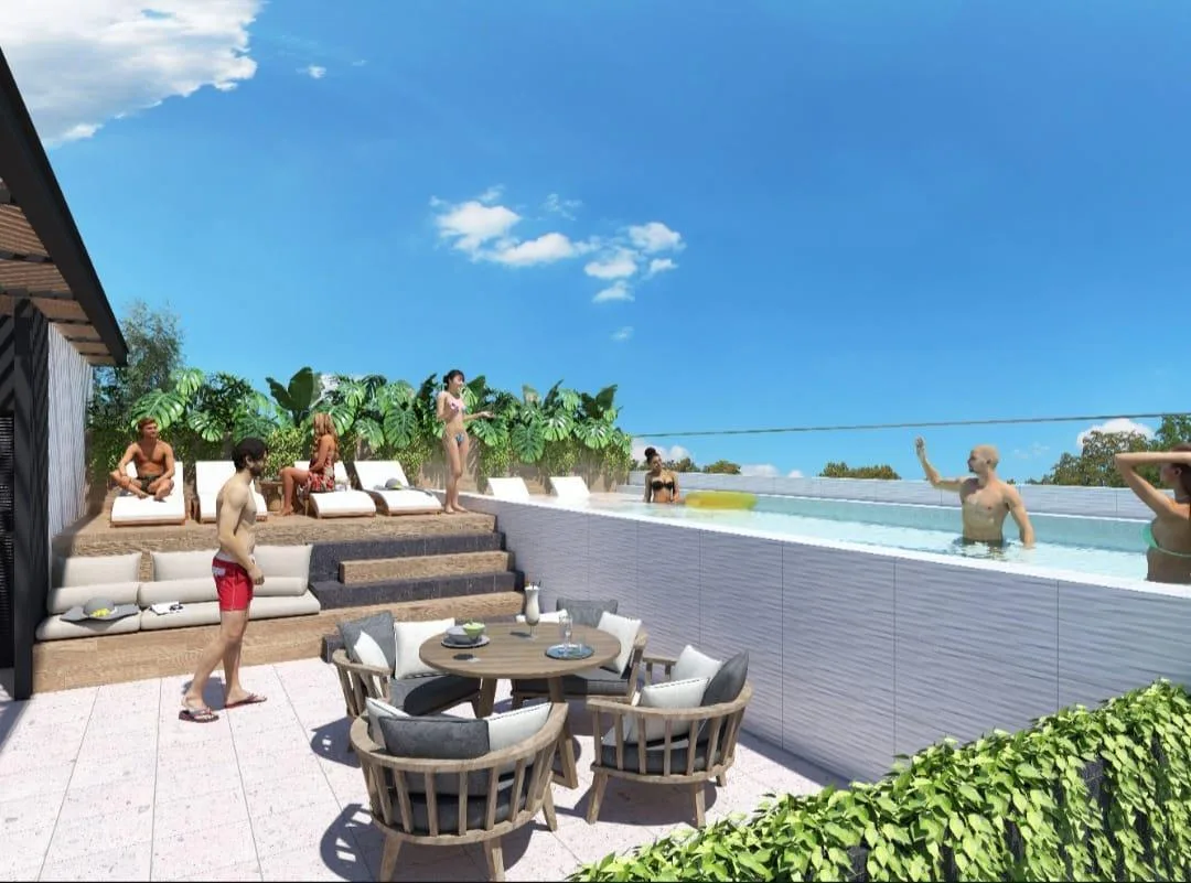The building offers a comprehensive suite of amenities. These include an elevator, mini storage units, a spa with a jacuzzi and an ice bath, a gym, access to electric bicycles, a rooftop pool with sun loungers, barbecue areas, common areas, a terrace, and security cameras.