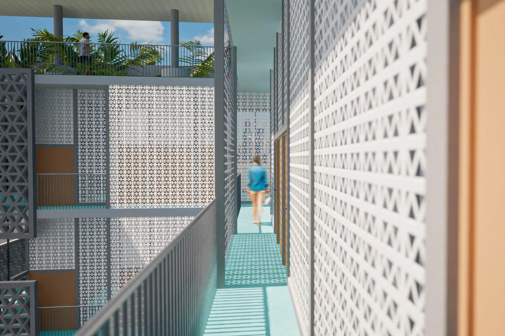 The building offers first-class amenities including a spectacular rooftop with an infinity pool, jacuzzi, outdoor cinema, and coworking areas. The project incorporates a commitment to Net Zero emissions.