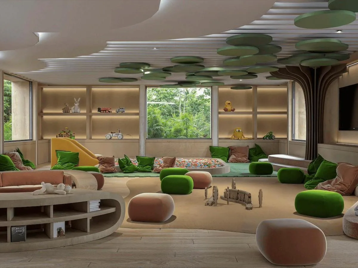 The residential clubhouse includes a bar and restaurant, an adult swimming pool with a swim lane, a playroom, a teen lounge, a spa with steam room and jacuzzi, and a fully equipped gym.