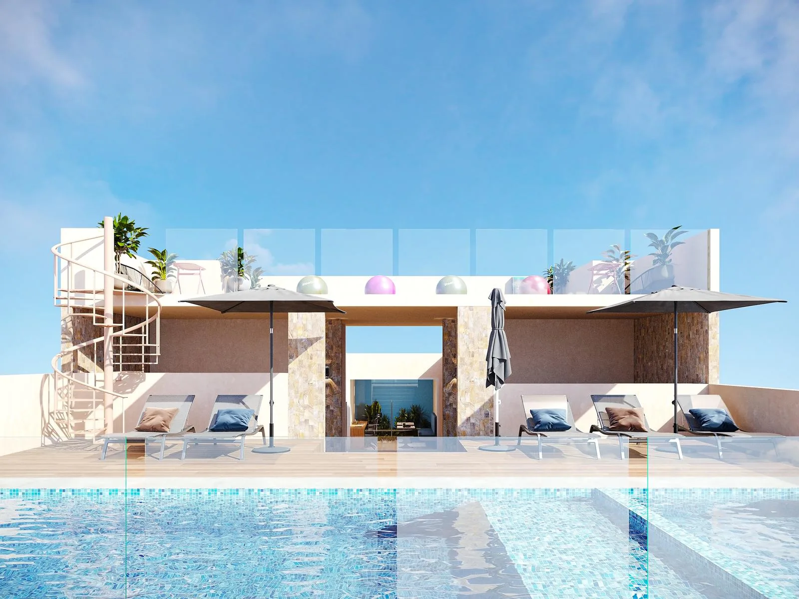 Building amenities include a swimming pool, sauna, spa, grill area, coworking space, parking, laundry facilities, a jacuzzi, and a sky bar.