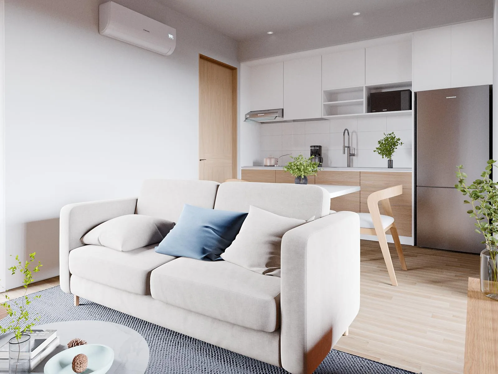 The unit measures 39 square meters. It features two bedrooms and two bathrooms, along with a kitchen area. The apartment will be delivered fully equipped and furnished.