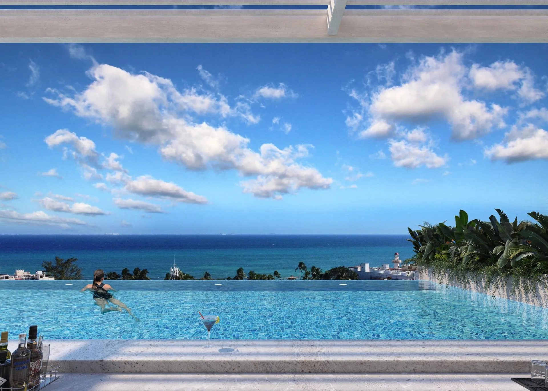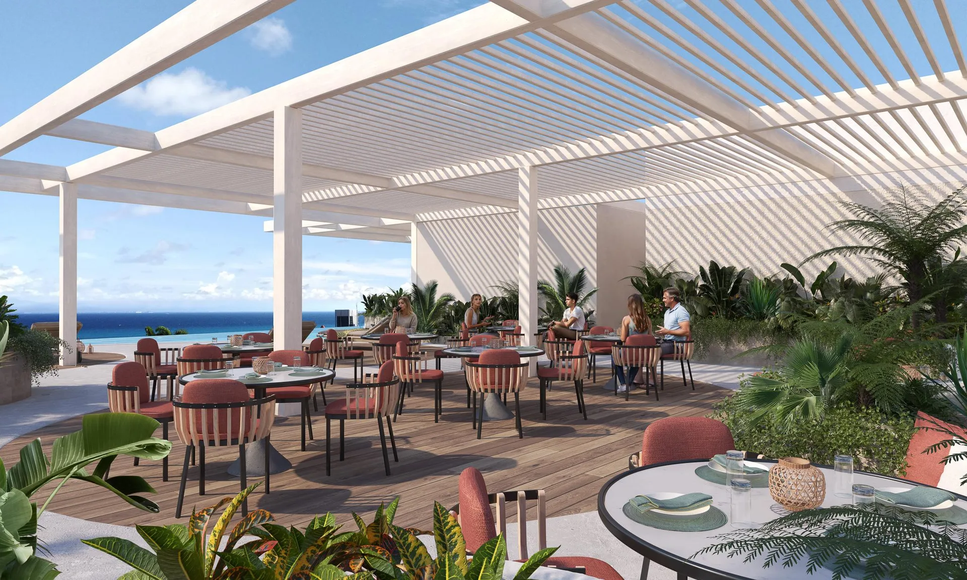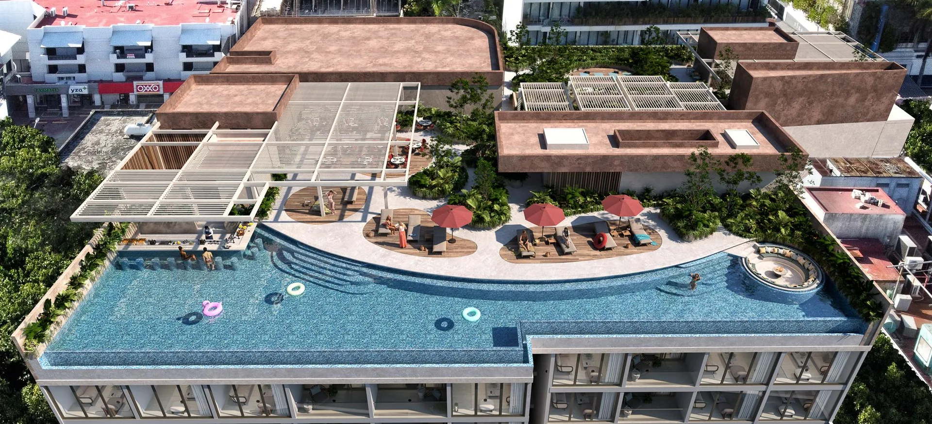 The building features a private rooftop sanctuary with a resort-like concept. It includes an impressive infinity pool with panoramic Caribbean Sea views, lounge areas, a poolside bar, and exclusive gourmet spaces such as a Chef's Table. For wellness, there is a state-of-the-art gym, yoga studios, a sauna, and a steam room. High-speed internet coworking areas are also available.
