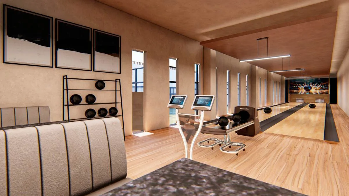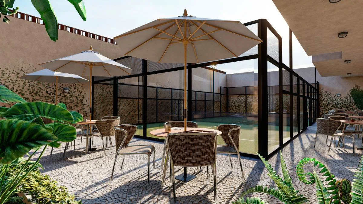 Building amenities include a sky pool, sun loungers, a barbecue area, a rowing area, a sauna, a gym, coworking space, parking, and security.