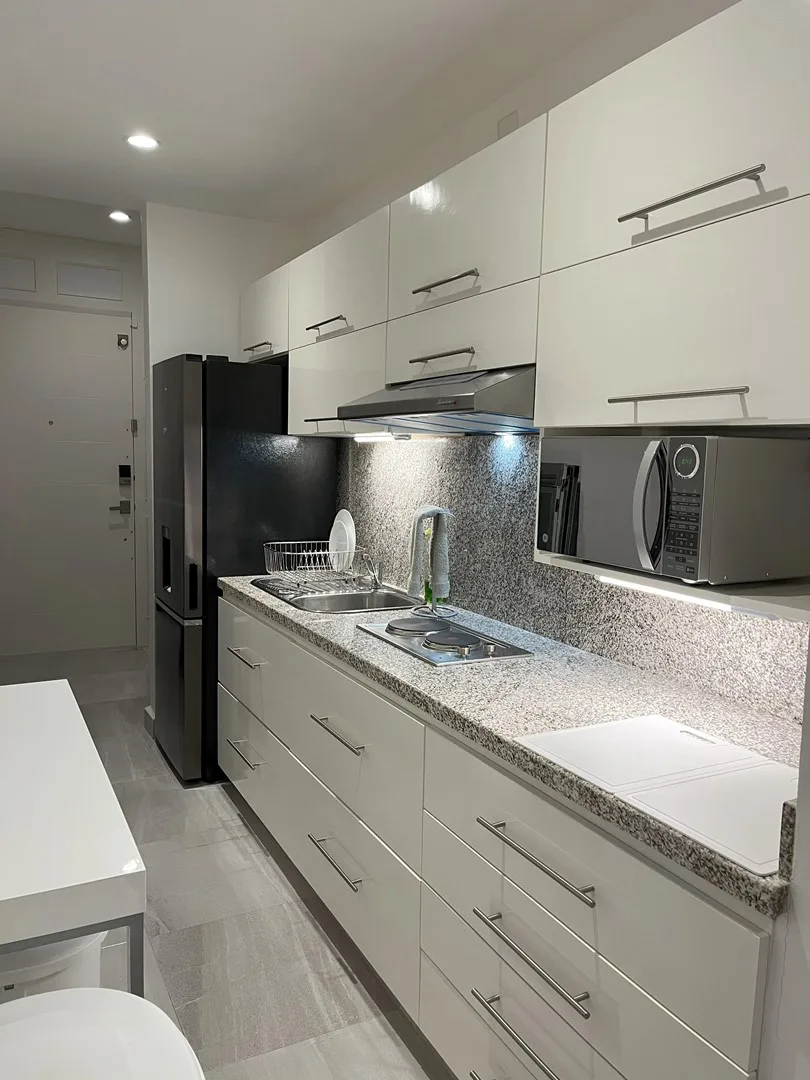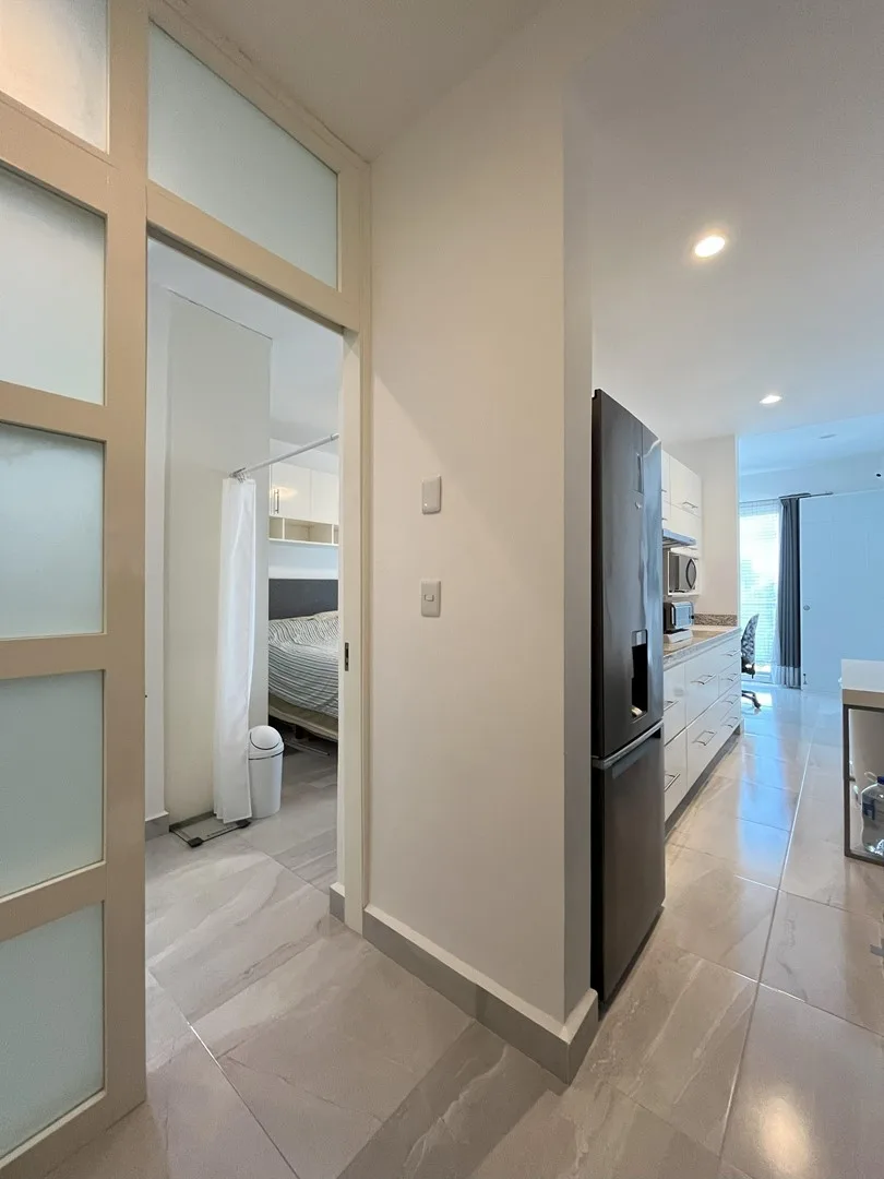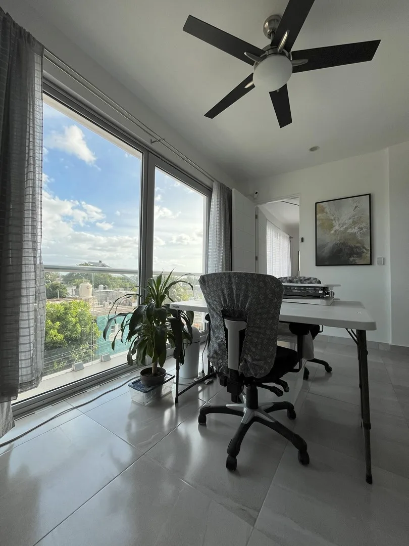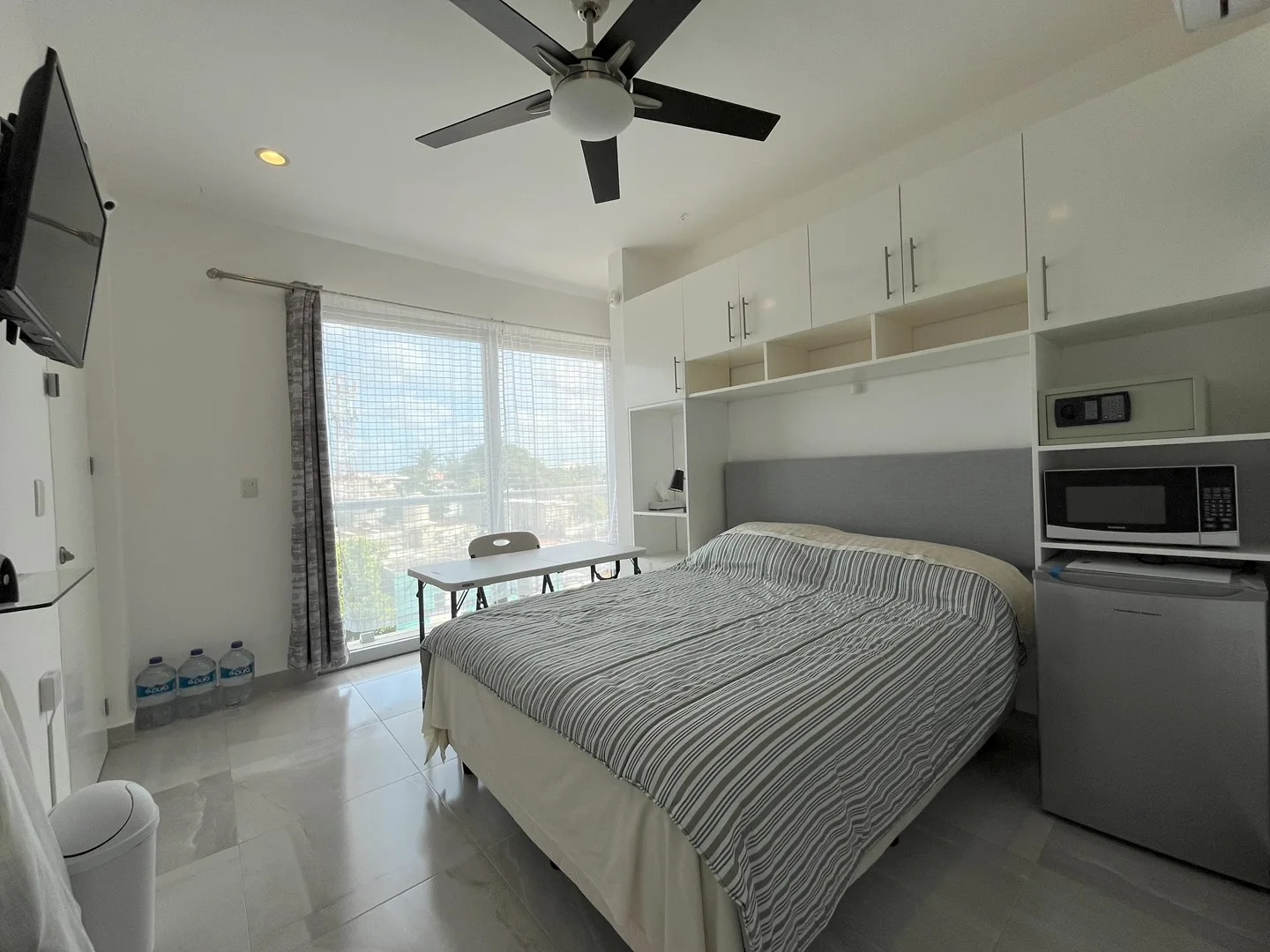 Situated on a one-way residential street, this condominium offers a tranquil living experience away from the busier tourist areas of Playa del Carmen. The building, completed in 2020, is the tallest in several surrounding blocks and features a rooftop equipped with a swimming pool, a solarium, and a lounge area offering spectacular views of sunrises, sunsets, and the ocean.