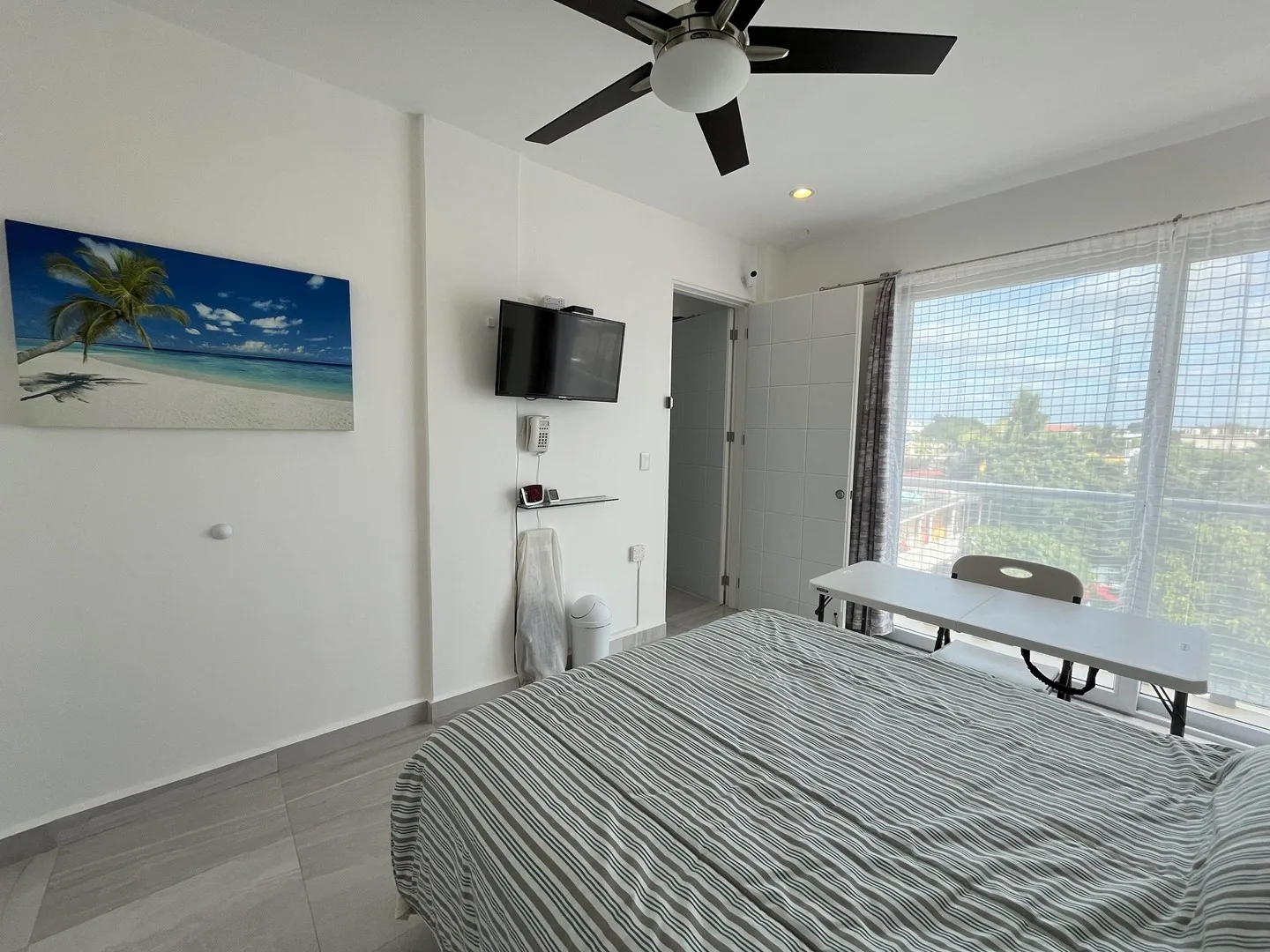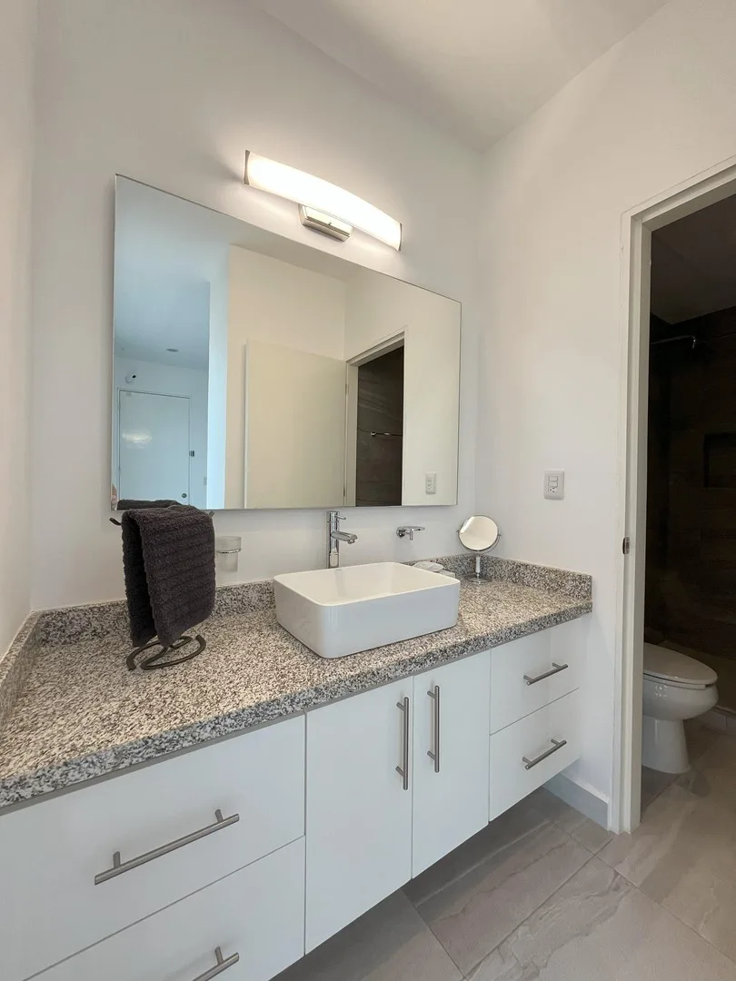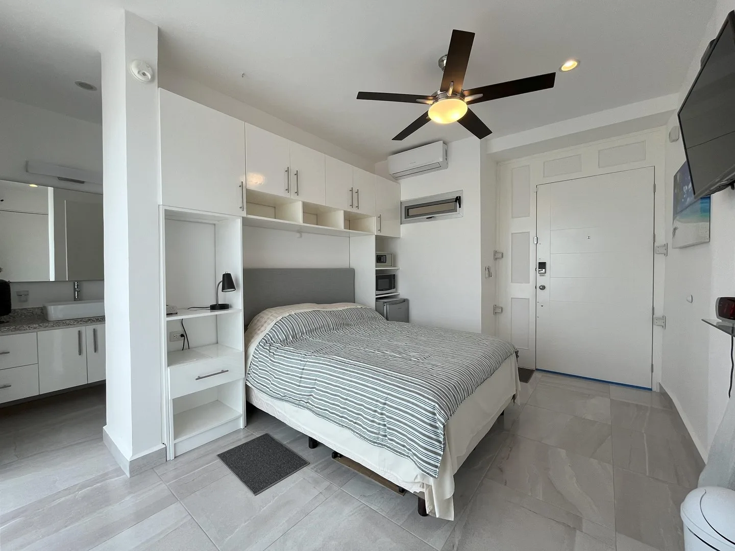 Situated on a one-way residential street, this condominium offers a tranquil living experience away from the busier tourist areas of Playa del Carmen. The building, completed in 2020, is the tallest in several surrounding blocks and features a rooftop equipped with a swimming pool, a solarium, and a lounge area offering spectacular views of sunrises, sunsets, and the ocean.