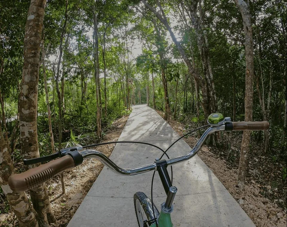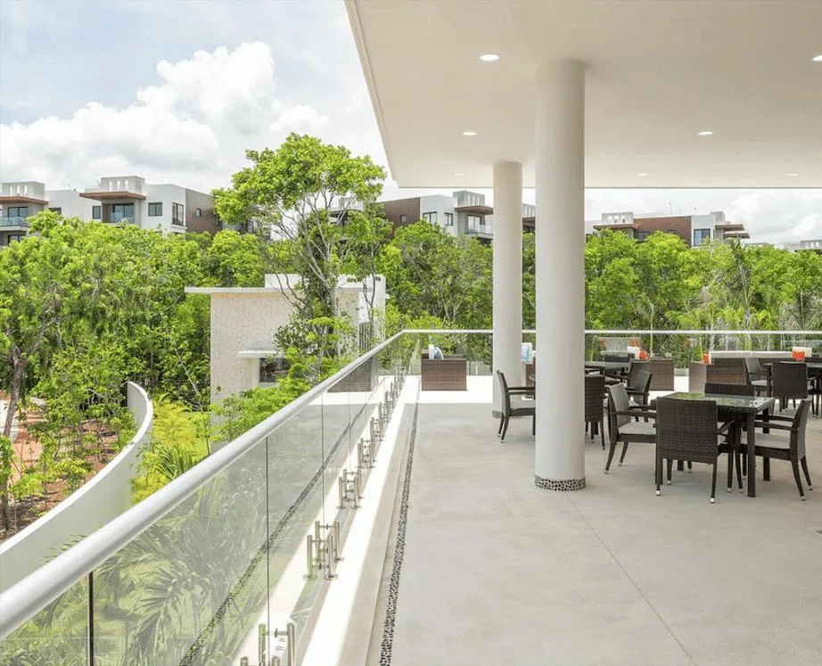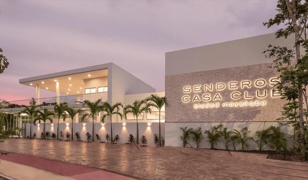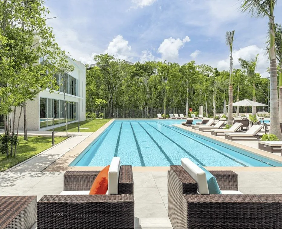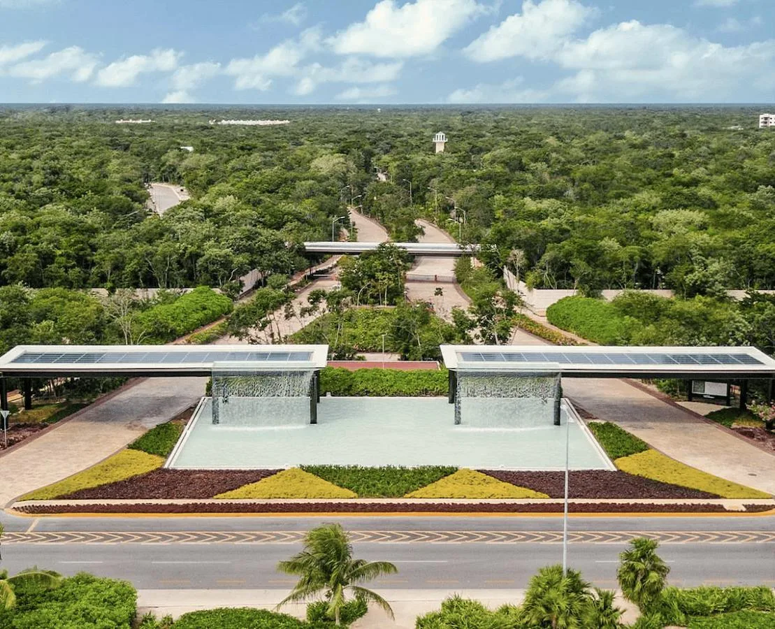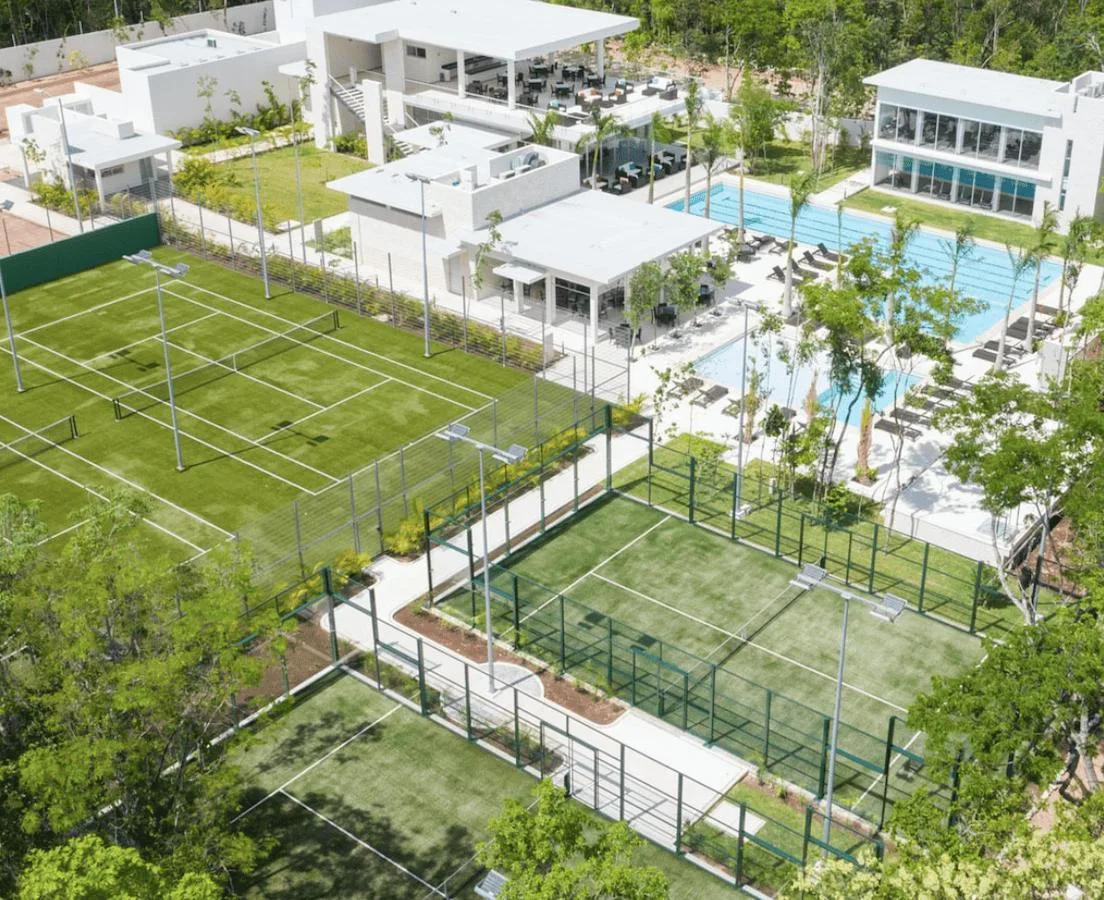 Community amenities include a clubhouse with separate pools for children and adults, a swimming lane pool, a restaurant and bar, an event hall, tennis and paddle courts, and a fully equipped gym. Additional features include sports courts, walkways, and bike paths integrated into green areas, along with themed parks designed for pets, children, and cenotes.