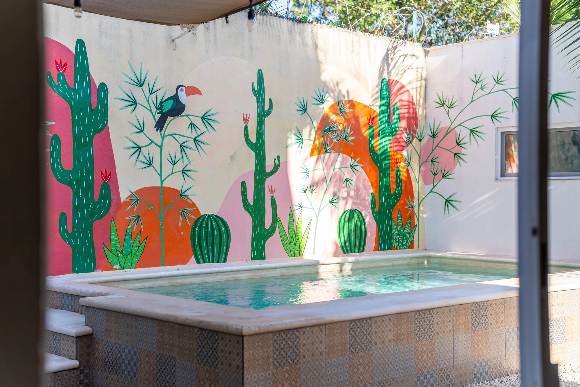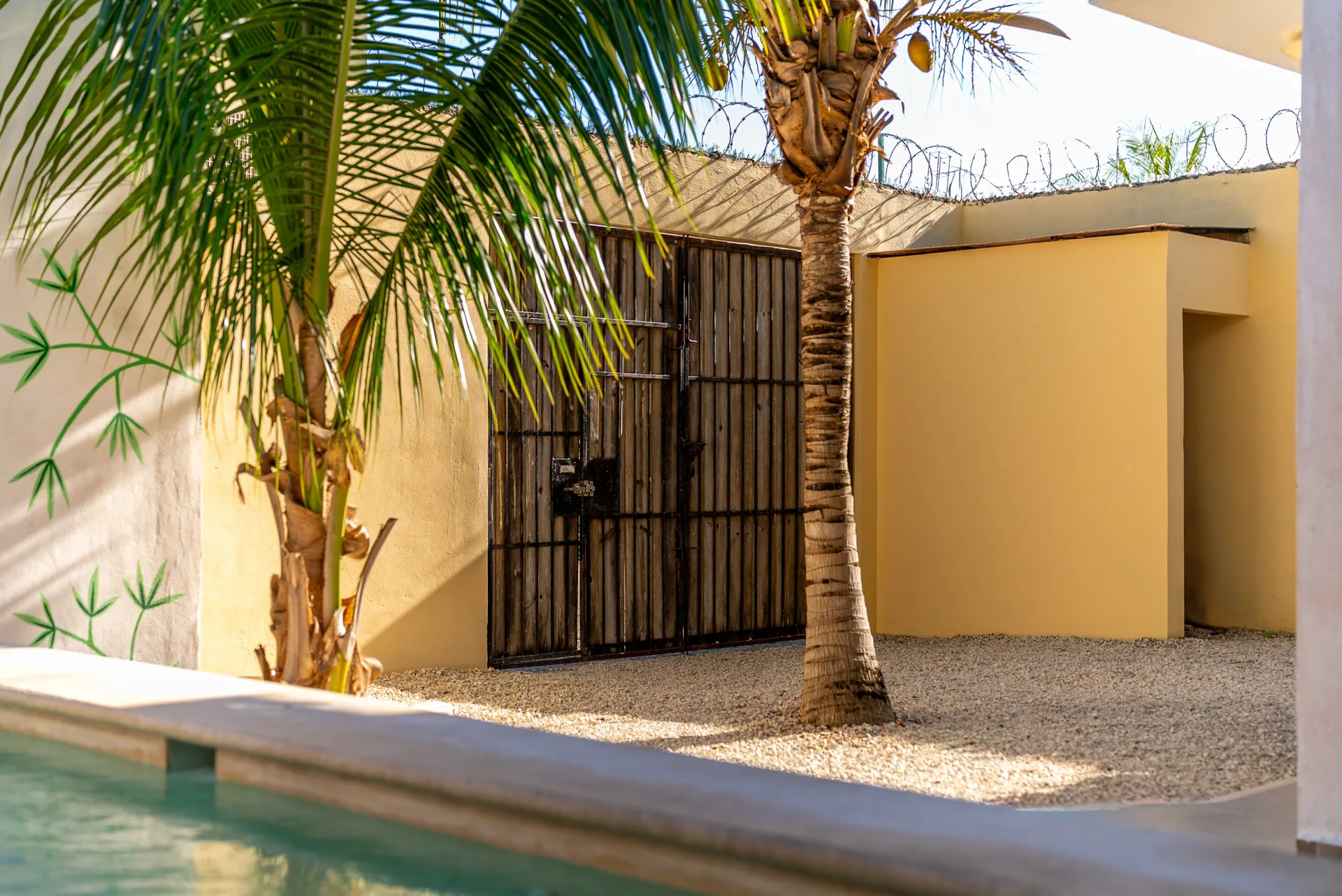 The grounds include space for parking a car, bicycles, and scooters inside the property, a practical workshop and storage area, a plunge pool, and a spacious outdoor dining and relaxation area.