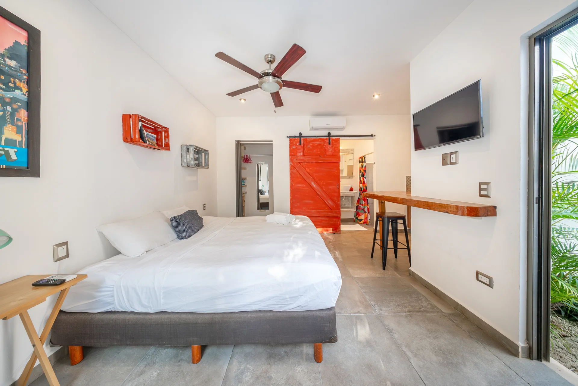 A terrace provides access to a fully independent studio, which features its own full bathroom and kitchenette, as well as to the main house.