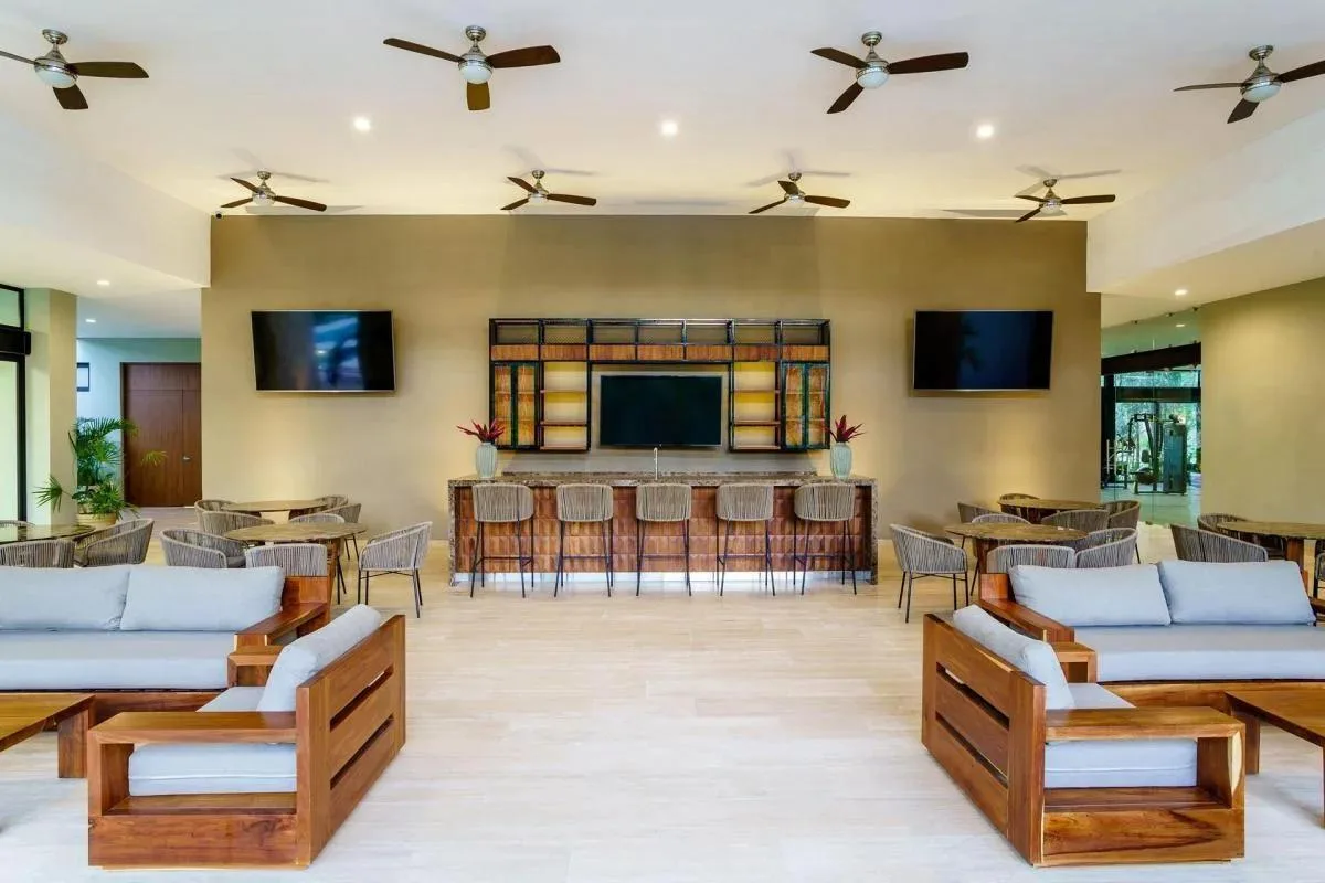 The residential development includes a multi-activity club with over 18 features. Amenities include a billiards room, a fitness center, children's play areas, and green spaces. The property benefits from 24/7 security and controlled access.