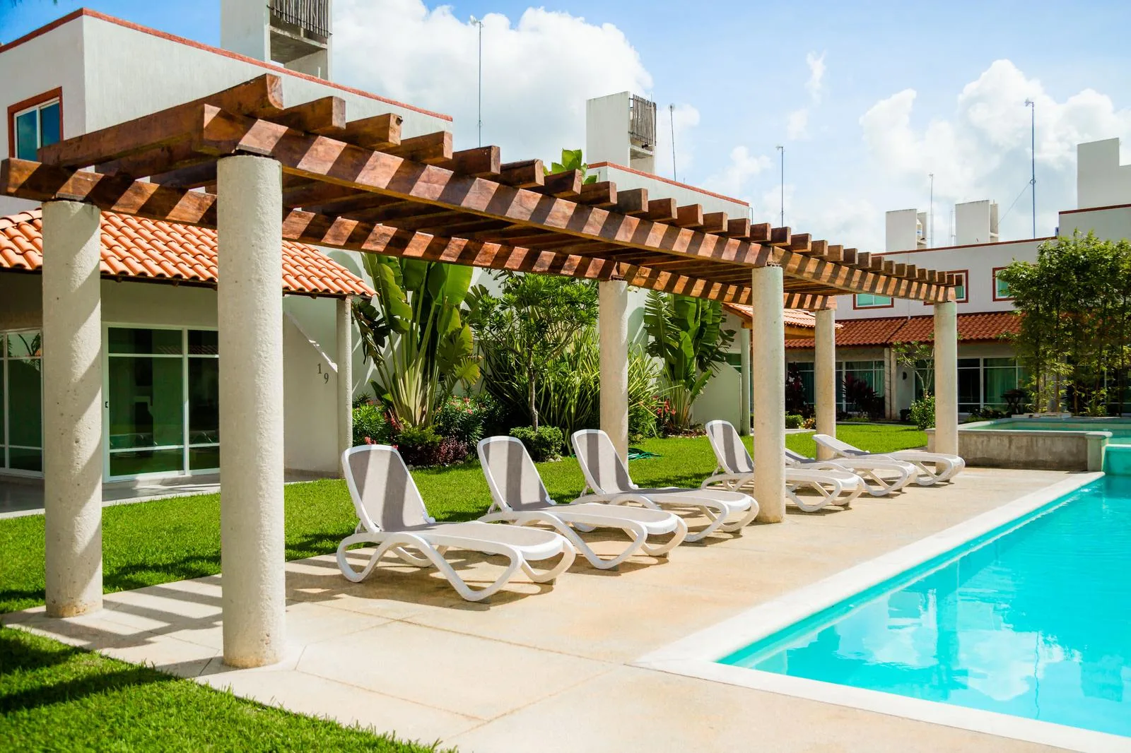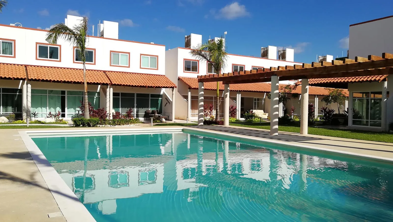 The development offers a pool with sunbathing areas, an outdoor gym, a children's playground, palapas, and green areas. Security features include a booth with cameras, controlled access, and independent private streets.