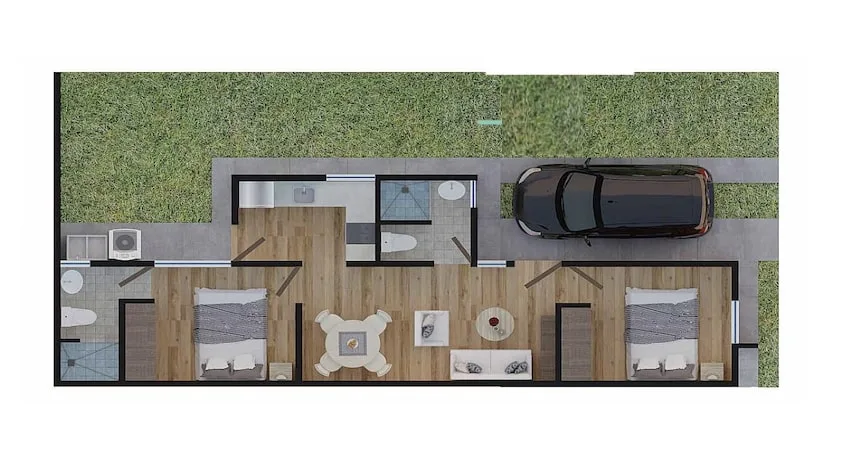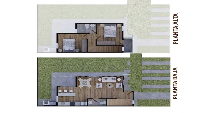 Several home models are available. The Nicté model offers 68. 42 square meters of construction on a 128 square meter lot. The ground floor includes a living room, dining room, kitchen, a half bathroom, laundry room, parking for two cars, a 40 square meter backyard, and a service hallway. The upper floor contains two bedrooms and one full bathroom. An expansion option is available.