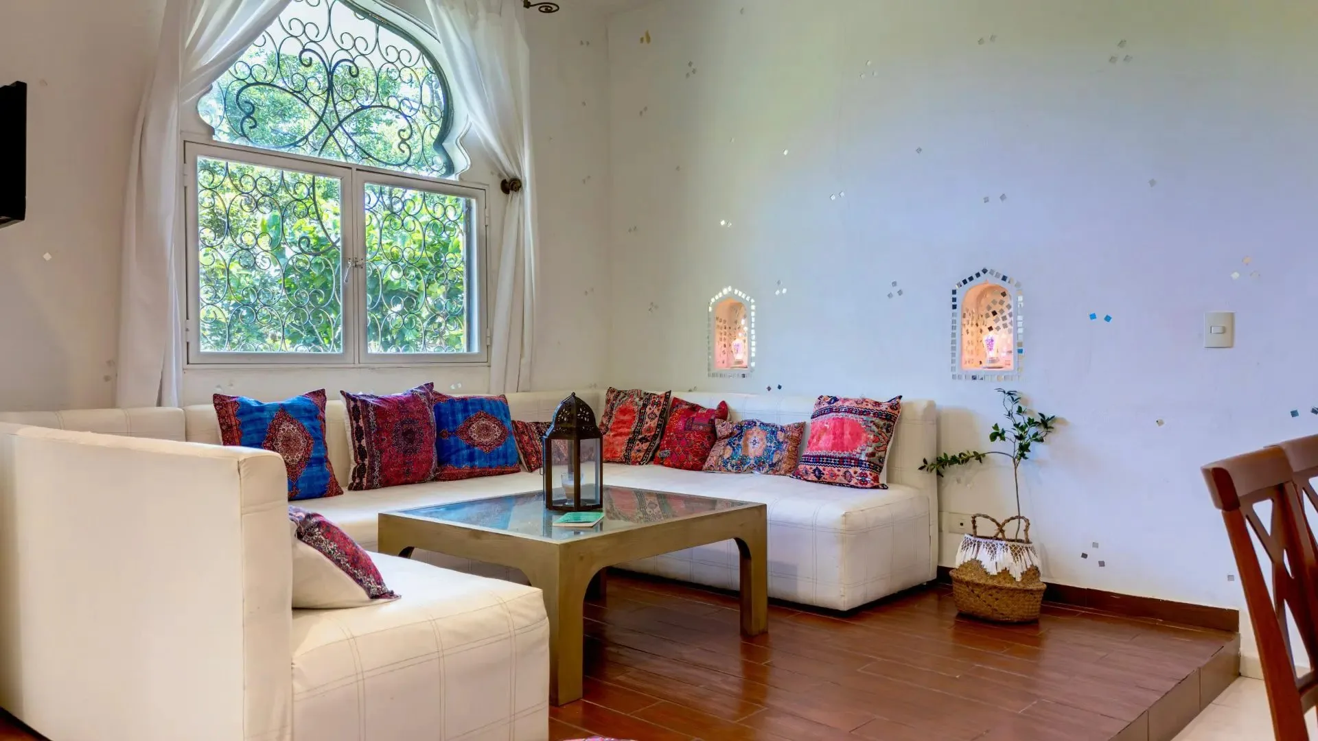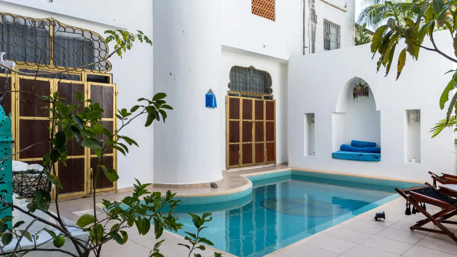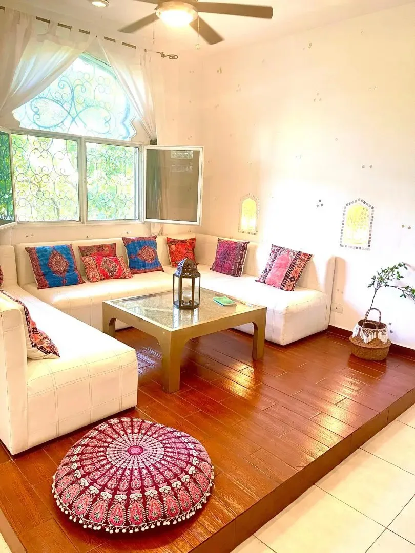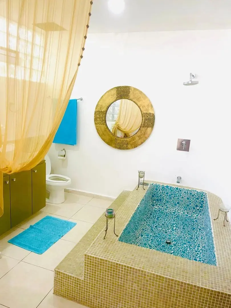 The three-level apartment building contains one residence per floor, each approximately 106 square meters. Each apartment offers two bedrooms, two bathrooms, and complete privacy. The design is Moroccan-inspired, with handcrafted mosaic details and bathtubs finished with imported Italian tile.