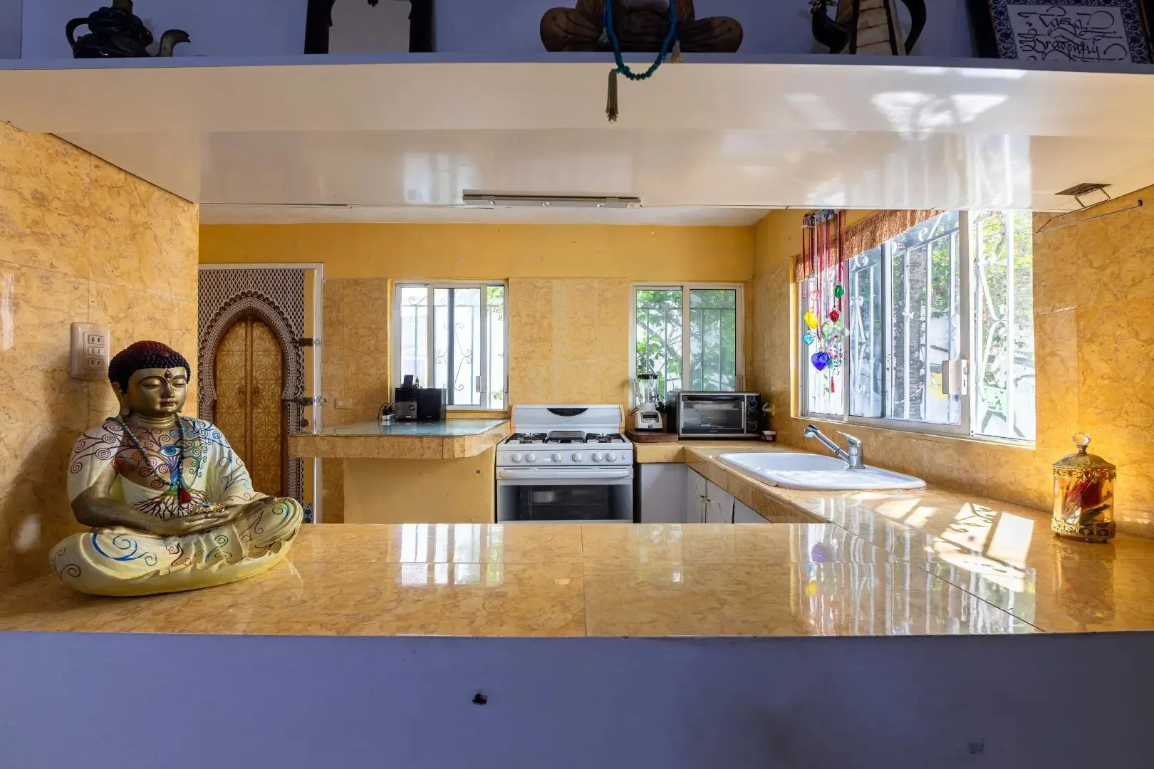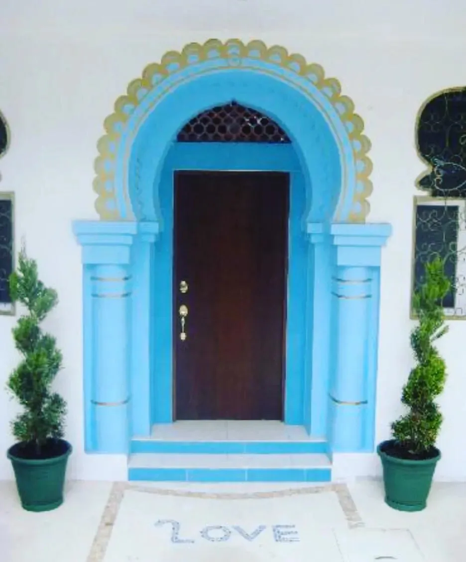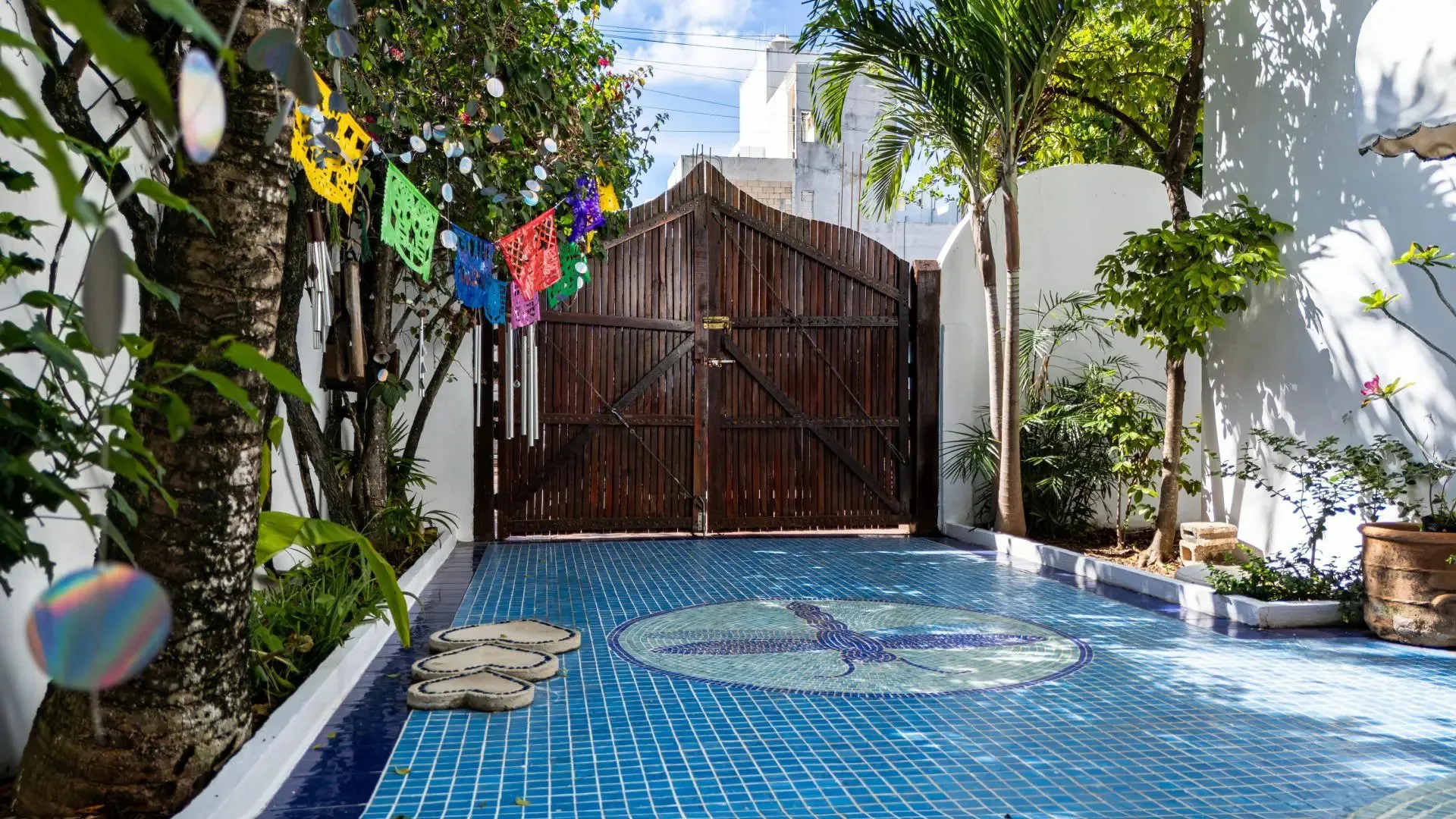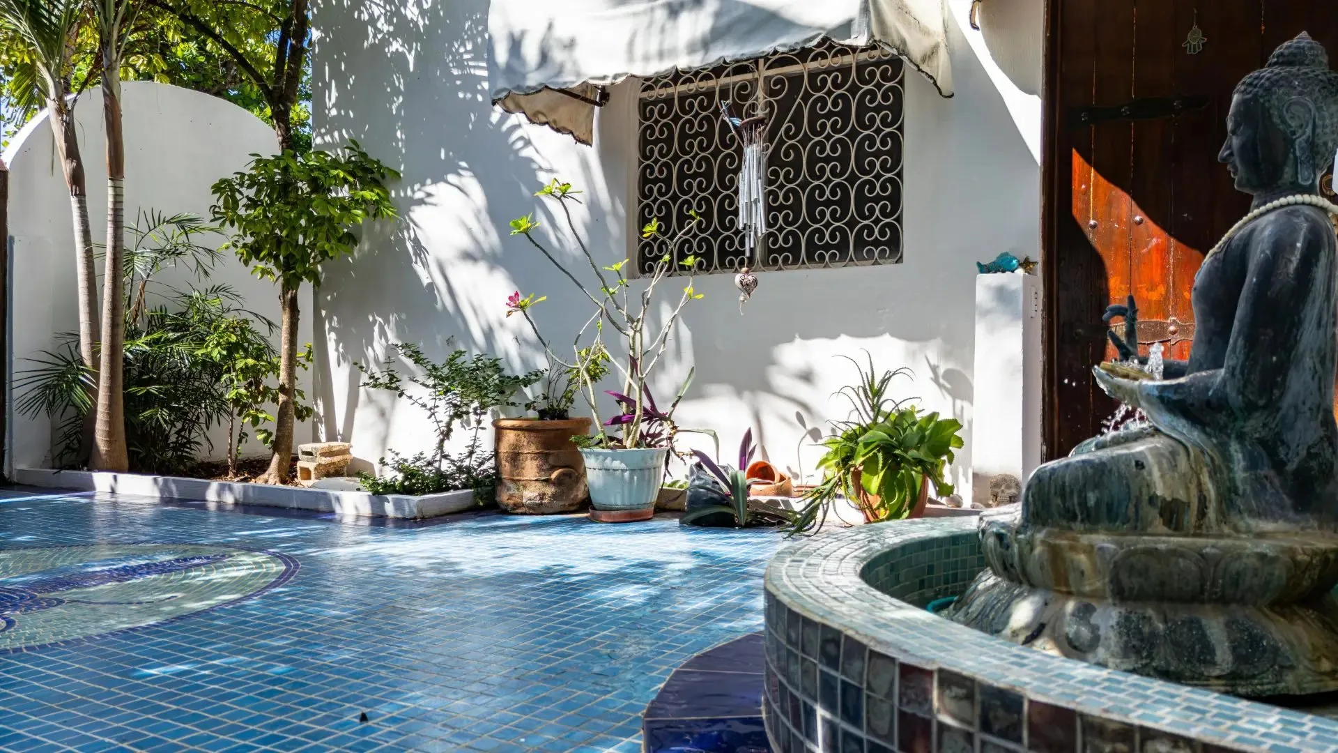 The architectural style is bohemian, artistic, and timeless. The entrance is lined with mosaic, accompanied by a softly flowing fountain and layered greenery.