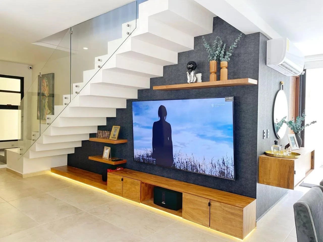 A standout feature is the spectacular rooftop terrace equipped with a pergola, grill, planters, and a half-bathroom. It includes an integrated projector, making it perfect for outdoor cinema nights and gatherings.