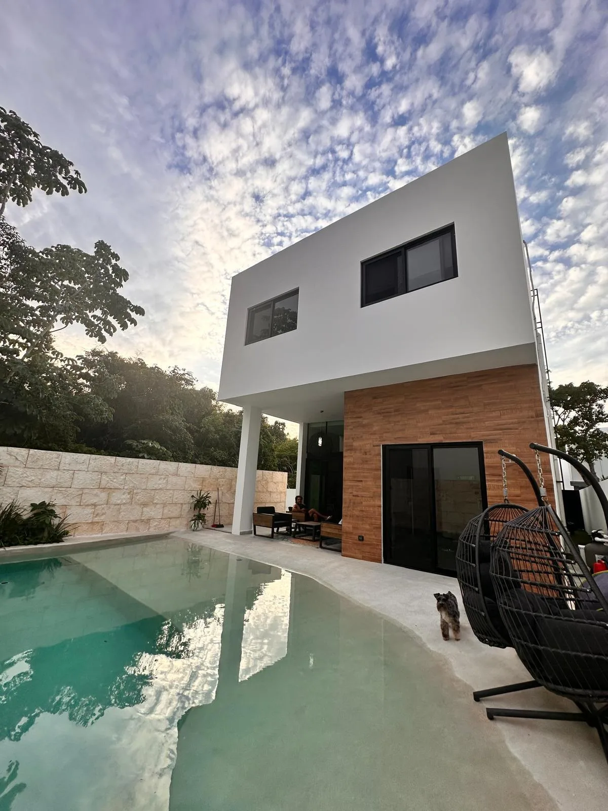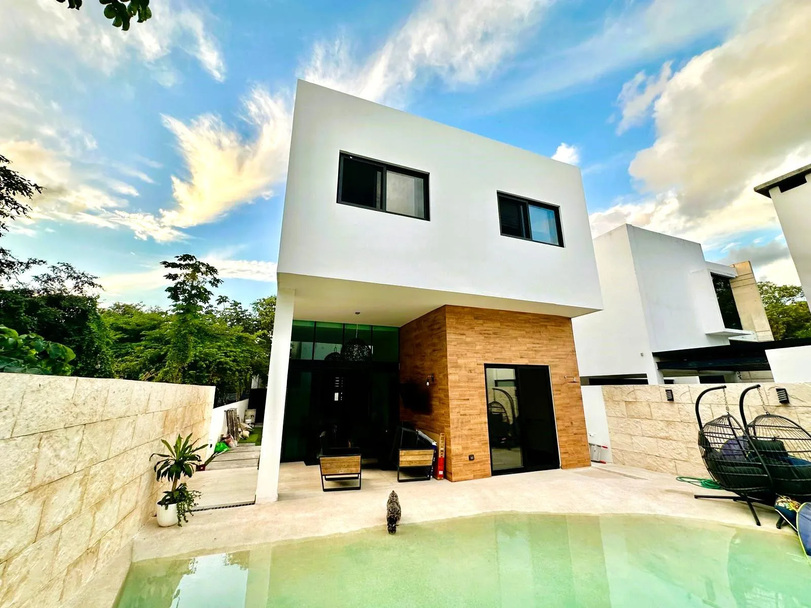 The house includes a private swimming pool. Residents also have access to the complex's amenities, which include soccer, volleyball, basketball, and tennis courts, as well as a lake. The grounds are expansive and surrounded by regional flora and fauna, creating a harmonious environment.